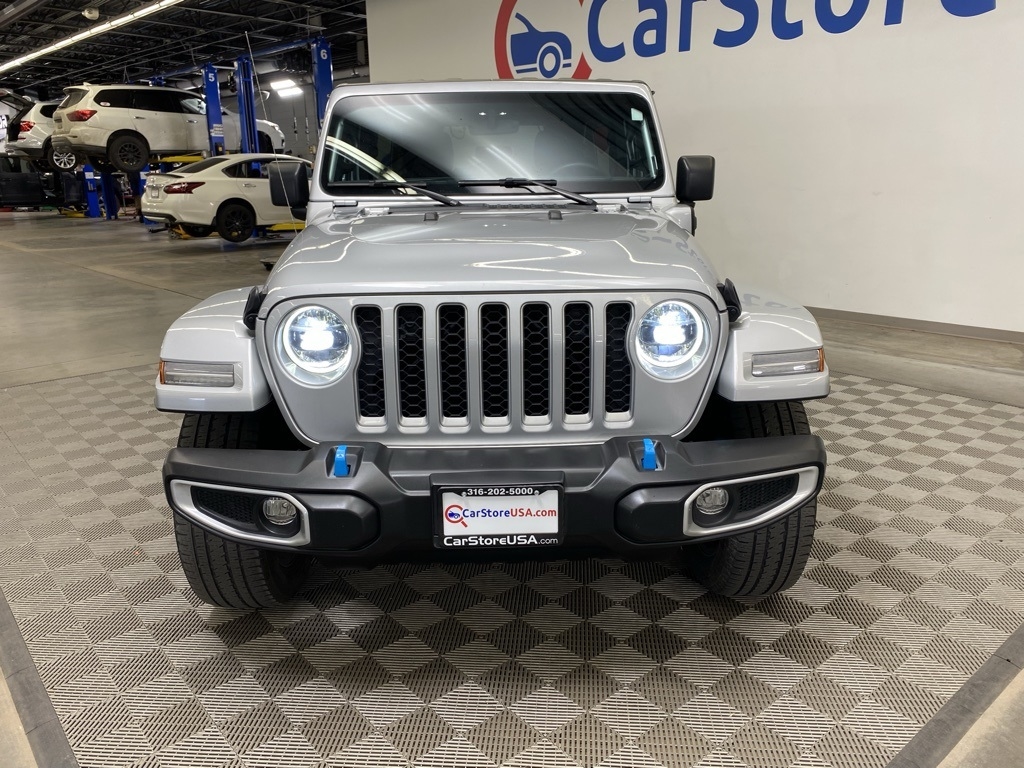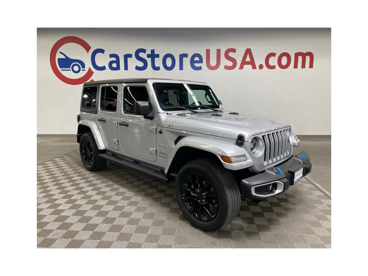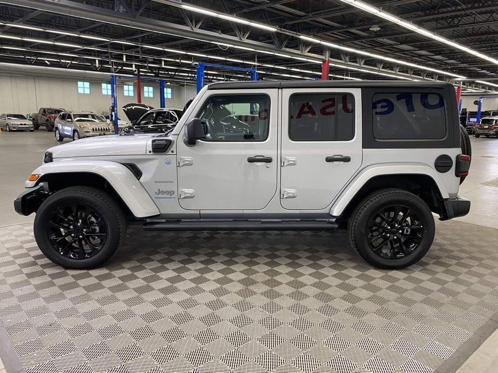 CARFAX One-Owner. THIS VEHICLE IS EQUIPPED WITH THE FOLLOWING FEATURES AND OPTIONS Quick Order Package 29P Sahara, Trailer Tow & Aux Switch Group (700 Amp Maintenance Free Battery and Auxiliary Switches), 3.73 Rear Axle Ratio, 4-Wheel Disc Brakes, 9 Speakers, ABS brakes, Air Conditioning, Alloy wheels, AM/FM radio: SiriusXM, Apple CarPlay/Android Auto, Auto-dimming Rear-View mirror, Automatic temperature control, Black 3-Piece Hard Top, Brake assist, Compass, Delay-off headlights, Driver door bin, Driver vanity mirror, Dual front impact airbags, Dual front side impact airbags, Electronic Stability Control, Emergency communication system: SiriusXM Guardian, Freedom Panel Storage Bag, Front anti-roll bar, Front Bucket Seats, Front Center Armrest w/Storage, Front dual zone A/C, Front fog lights, Front License Plate Bracket, Front reading lights, Fully automatic headlights, Garage door transmitter, Heated door mirrors, Illuminated entry, Integrated roll-over protection, Leather Shift Knob, Low tire pressure warning, Mopar Black Tubular Side Steps, Navigation System, Occupant sensing airbag, Outside temperature display, Panic alarm, ParkView Rear Back-Up Camera, Passenger door bin, Passenger vanity mirror, Power door mirrors, Power steering, Power windows, Premium McKinley Trimmed Seats, Radio data system, Radio: Uconnect 4C Nav w/8.4" Display, Rear anti-roll bar, Rear reading lights, Rear seat center armrest, Rear Window Defroster, Rear Window Wiper/Washer, Remote keyless entry, Security system, Speed control, Split folding rear seat, Sport Suspension, Steering wheel mounted audio controls, Tachometer, Telescoping steering wheel, Tilt steering wheel, Traction control, Trip computer, Variably intermittent wipers, Voltmeter, and Wheels: 20" x 8" Fully Painted Aluminum. Silver Zynith Clearcoat 2023 Jeep Wrangler Sahara 4xe 4WD 8-Speed Automatic 2.0L I4 DOHC