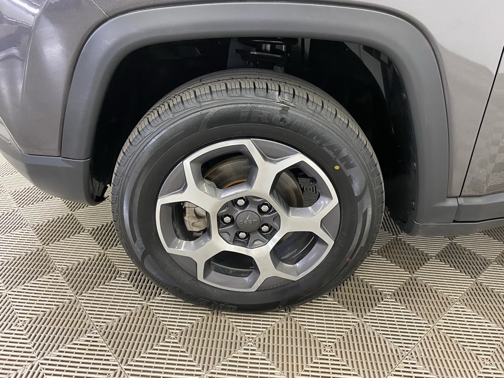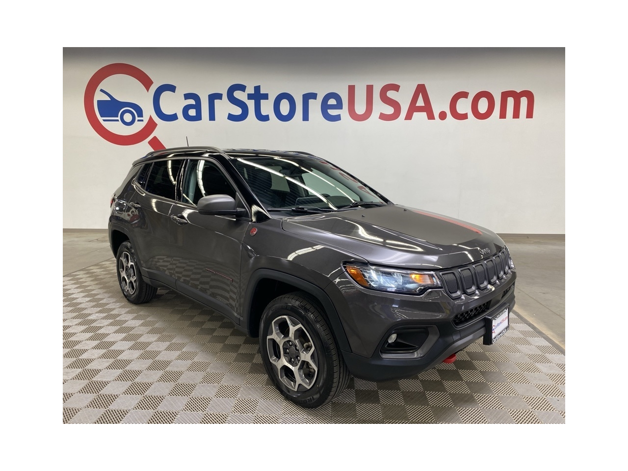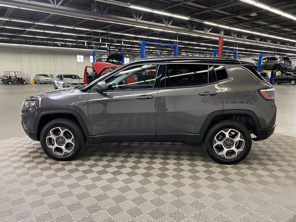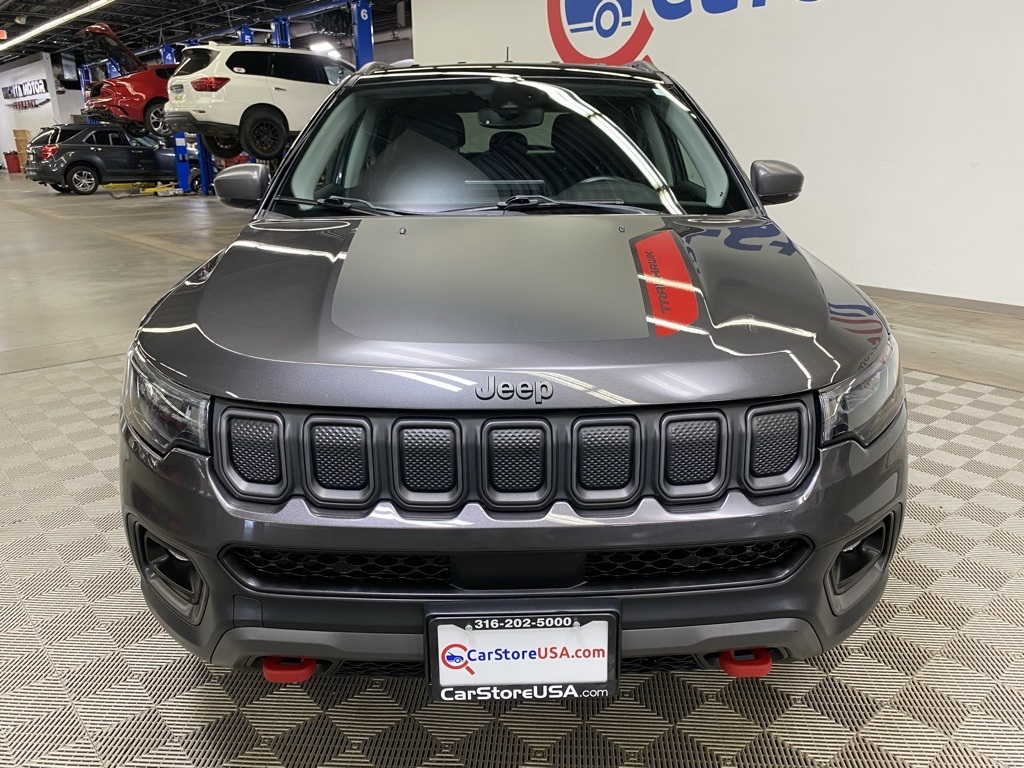 THIS VEHICLE IS EQUIPPED WITH THE FOLLOWING FEATURES AND OPTIONS Quick Order Package 2GE, Trailhawk Convenience Group (115V Auxiliary Power Outlet, 2nd Row USB Type A/C Charge Only, Heated Front Seats, Leather Wrapped Steering Wheel, Power 2-Way Driver Lumbar Adjust, Power Adjust 8-Way Driver Seat, Remote Start System, Reversible Carpet/Vinyl Cargo Mat, Vehicle Information Center, and Windshield Wiper De-Icer), 10.1" Touchscreen Display, 4-Wheel Disc Brakes, 4.334 Axle Ratio, 6 Speakers, ABS brakes, Air Conditioning, Alloy wheels, AM/FM radio: SiriusXM, Anti-whiplash front head restraints, Auto High-beam Headlights, Auto-dimming Rear-View mirror, Automatic temperature control, Brake assist, Bumpers: body-color, Compass, Delay-off headlights, Disassociated Touchscreen Display, Driver door bin, Driver vanity mirror, Dual front impact airbags, Dual front side impact airbags, Electronic Stability Control, Emergency communication system: SiriusXM Guardian, Four wheel independent suspension, Front anti-roll bar, Front Bucket Seats, Front Center Armrest w/Storage, Front dual zone A/C, Front fog lights, Front License Plate Bracket, Front reading lights, Fully automatic headlights, Global Telematics Box Module (TBM), Heated door mirrors, Illuminated entry, Knee airbag, Leather Shift Knob, Low tire pressure warning, Occupant sensing airbag, Outside temperature display, Overhead airbag, Overhead console, Panic alarm, ParkView Rear Back-Up Camera, Passenger door bin, Passenger vanity mirror, Power door mirrors, Power steering, Power windows, Premium Cloth/Leather Trim Bucket Seats, Radio: Uconnect 5 w/10.1" Display, Rain sensing wipers, Rear anti-roll bar, Rear seat center armrest, Rear window defroster, Rear window wiper, Remote keyless entry, Roof rack: rails only, Security system, Speed control, Split folding rear seat, Spoiler, Steering wheel mounted audio controls, Tachometer, Telescoping steering wheel, Tilt steering wheel, Traction control, Trip computer, Turn signal indicator mirrors, Variably intermittent wipers, and Wheels: 17" x 6.5" Painted Diamond Cut Aluminum. Clean CARFAX. Granite Crystal Metallic Clearcoat 2022 Jeep Compass Trailhawk 4WD 9-Speed 948TE Automatic 2.4L I4