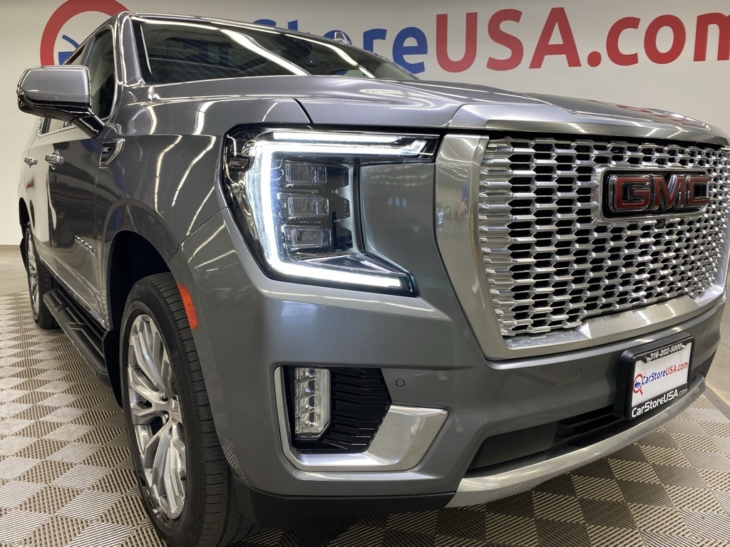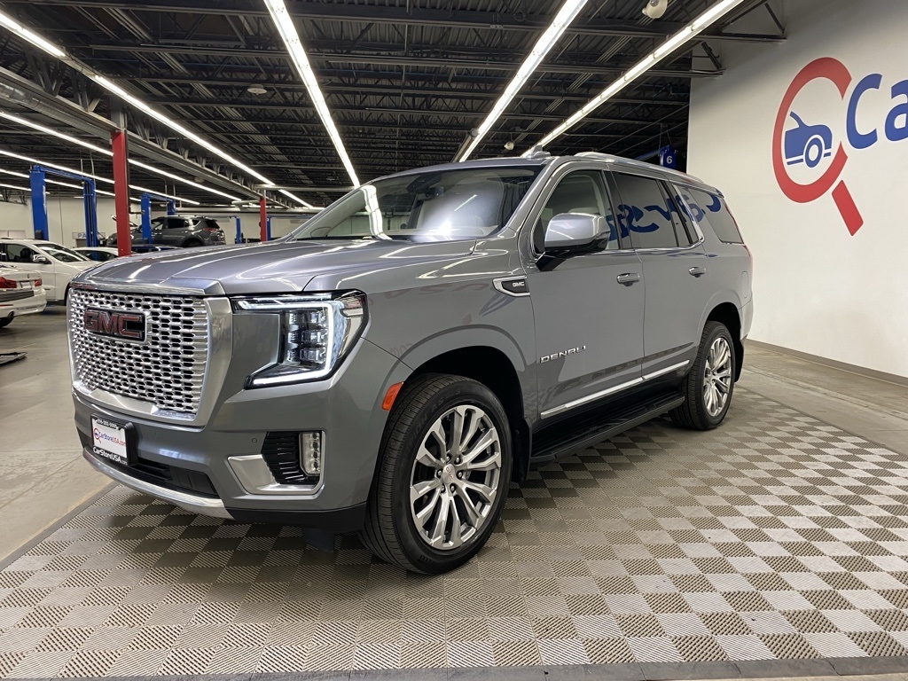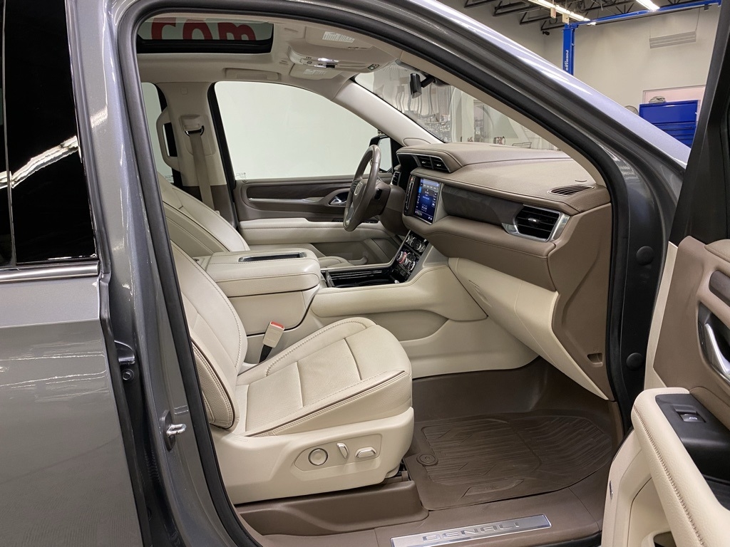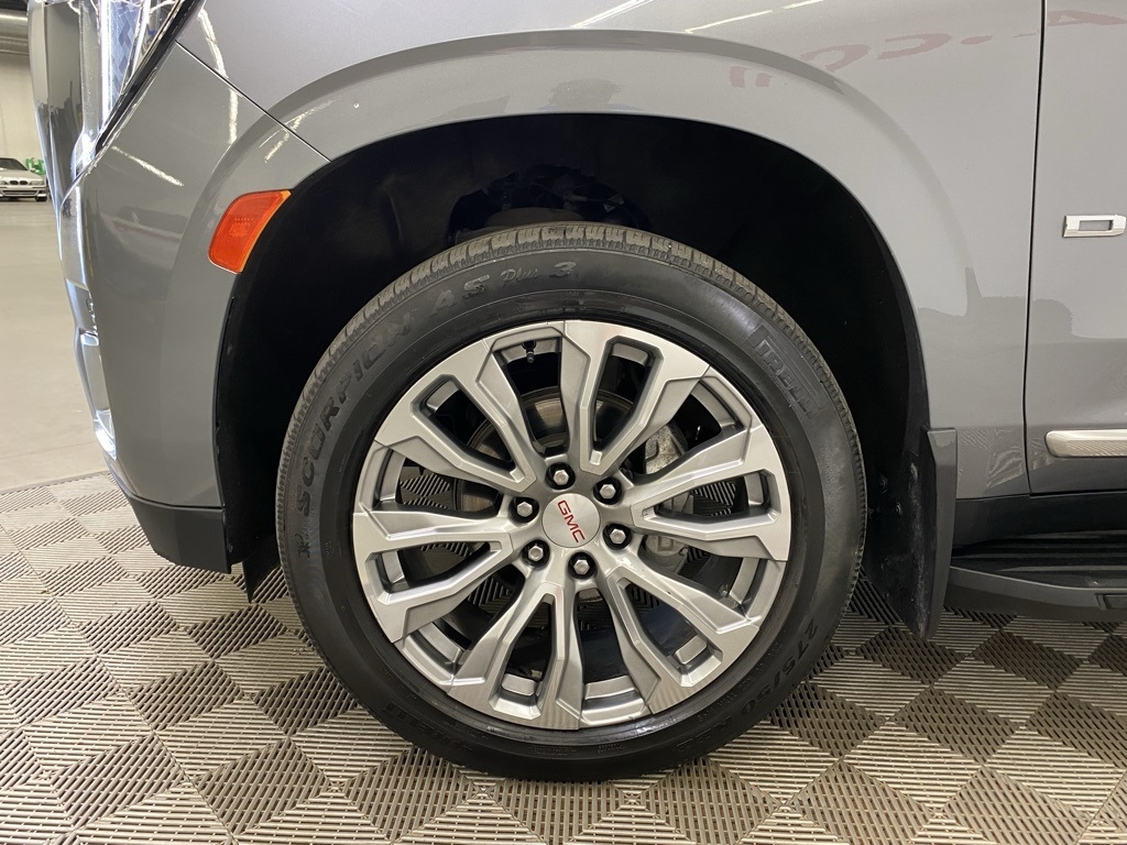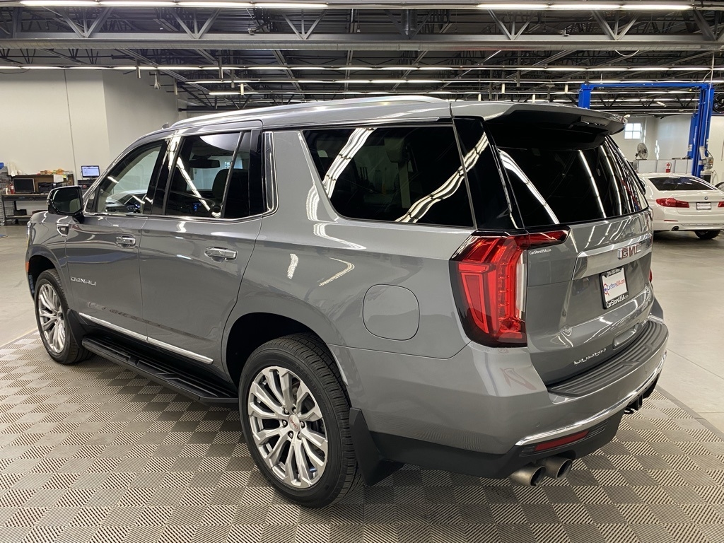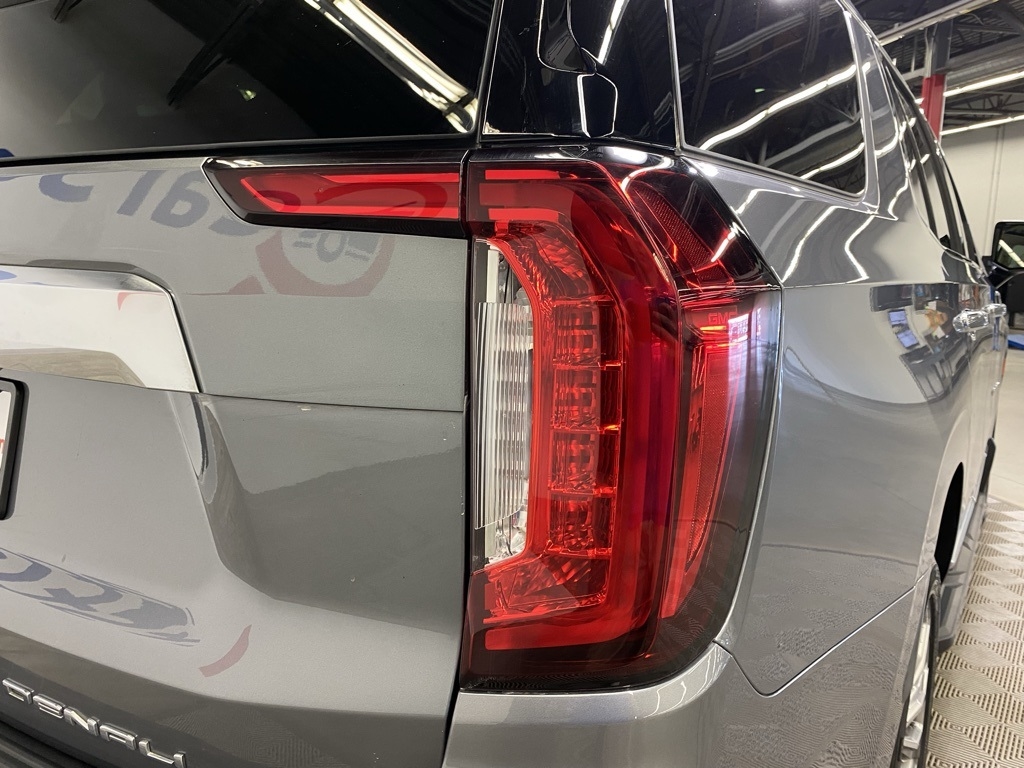 CARFAX One-Owner. THIS VEHICLE IS EQUIPPED WITH THE FOLLOWING FEATURES AND OPTIONS Illumination Package (LPO) (Illuminated Front GMC Emblem (LPO) and Illuminated Mirror GMC Emblem (LPO)), License Plate Front Mounting Package, Preferred Equipment Group 5SA (12-Way Power Seat Adjusters, 15" Diagonal Multi-Color Head-Up Display, 2 Presets For Outside Rearview Mirrors, 3rd Row 60/40 Power-Folding Split-Bench Seat, Bright Front & Rear Door Sill Plates, Chrome Door Handles w/Body-Color Strip, Dual Exhaust System, Galvano Bodyside Moldings, Hands-Free Power Programmable Rear Liftgate, HD Surround Vision, Heated & Ventilated Driver & Front Passenger Seats, Heated 2nd Row Outboard Position Seats, Heated Automatic Steering Wheel, Heated Driver & Front Passenger Seats, Hill Descent Control, Inside Rear-View Auto-Dimming Mirror, Outside Heated Power-Adjustable Mirrors, Power Release 2nd Row Bucket Seats, Power Tilt & Telescopic Steering Column, Rear Pedestrian Alert, Safety Alert Seat, and Universal Home Remote), 14 Speakers, 3.23 Rear Axle Ratio, 3rd row seats: split-bench, 4-Wheel Disc Brakes, ABS brakes, Adaptive suspension, Air Conditioning, Alloy wheels, AM/FM radio: SiriusXM with 360L, Apple CarPlay/Android Auto, Auto High-beam Headlights, Auto-dimming door mirrors, Auto-dimming Rear-View mirror, Auto-leveling suspension, Automatic Emergency Braking, Automatic temperature control, Bodyside moldings, Bose 14-Speaker Surround w/CenterPoint, Brake assist, Bumpers: body-color, Compass, Delay-off headlights, Driver door bin, Driver vanity mirror, Dual front impact airbags, Dual front side impact airbags, Dual-Pane Panoramic Power Sunroof, Electronic Stability Control, Emergency communication system: OnStar and GMC connected services capable, Floor Console, Following Distance Indicator, Forward Collision Alert, Four wheel independent suspension, Front & Rear Park Assist, Front anti-roll bar, Front Bucket Seats, Front Center Armrest, Front dual zone A/C, Front fog lights, Front Pedestrian Braking, Front reading lights, Fully automatic headlights, Garage door transmitter, HD Radio, Heads-Up Display, Heated door mirrors, Heated front seats, Heated rear seats, Heated steering wheel, Illuminated entry, IntelliBeam Automatic High Beam On/Off, Lane Change Alert w/Side Blind Zone Alert, Lane Keep Assist w/Lane Departure Warning, Leather steering wheel, Low tire pressure warning, Magnetic Ride Control Suspension, Memory seat, Molded Splash Guards, Navigation System, Not Equipped w/Automatic Stop/Start, Not Equipped w/Steering Column Lock, Occupant sensing airbag, Outside temperature display, Overhead airbag, Overhead console, Panic alarm, Passenger door bin, Passenger vanity mirror, Perforated Leather Seating Surfaces, Power door mirrors, Power driver seat, Power Liftgate, Power passenger seat, Power steering, Power windows, Radio: AM/FM/SiriusXM w/Navigation, Rain sensing wipers, Rear air conditioning, Rear anti-roll bar, Rear Cross Traffic Alert, Rear reading lights, Rear Seat Media System, Rear window defroster, Rear window wiper, Remote keyless entry, Roof rack: rails only, Security system, SiriusXM w/360L, Speed control, Speed-sensing steering, Split folding rear seat, Spoiler, Steering wheel memory, Steering wheel mounted audio controls, Tachometer, Telescoping steering wheel, Tilt steering wheel, Traction control, Trip computer, Turn signal indicator mirrors, Variably intermittent wipers, Ventilated front seats, Voltmeter, Wheel Locks, Wheels: 20" x 9" 6-Spoke Polished Aluminum, and Wheels: 22" x 9" Bright Machined Aluminum. Satin Steel Metallic 2021 GMC Yukon Denali 4WD 10-Speed Automatic with Overdrive EcoTec3 6.2L V8