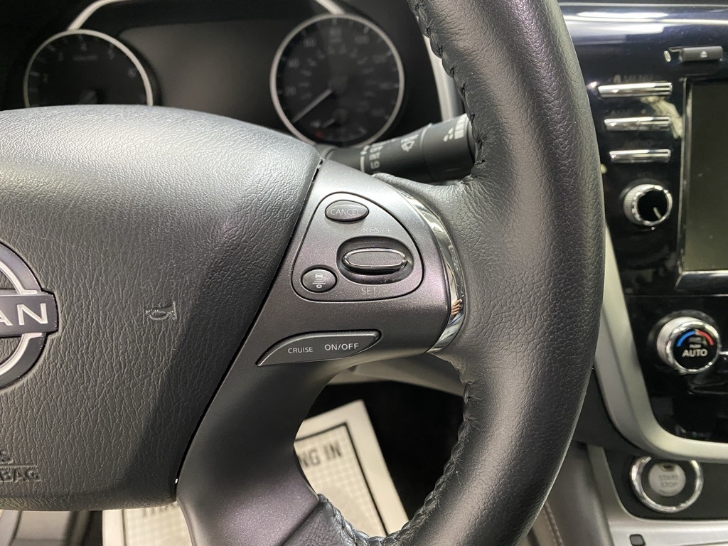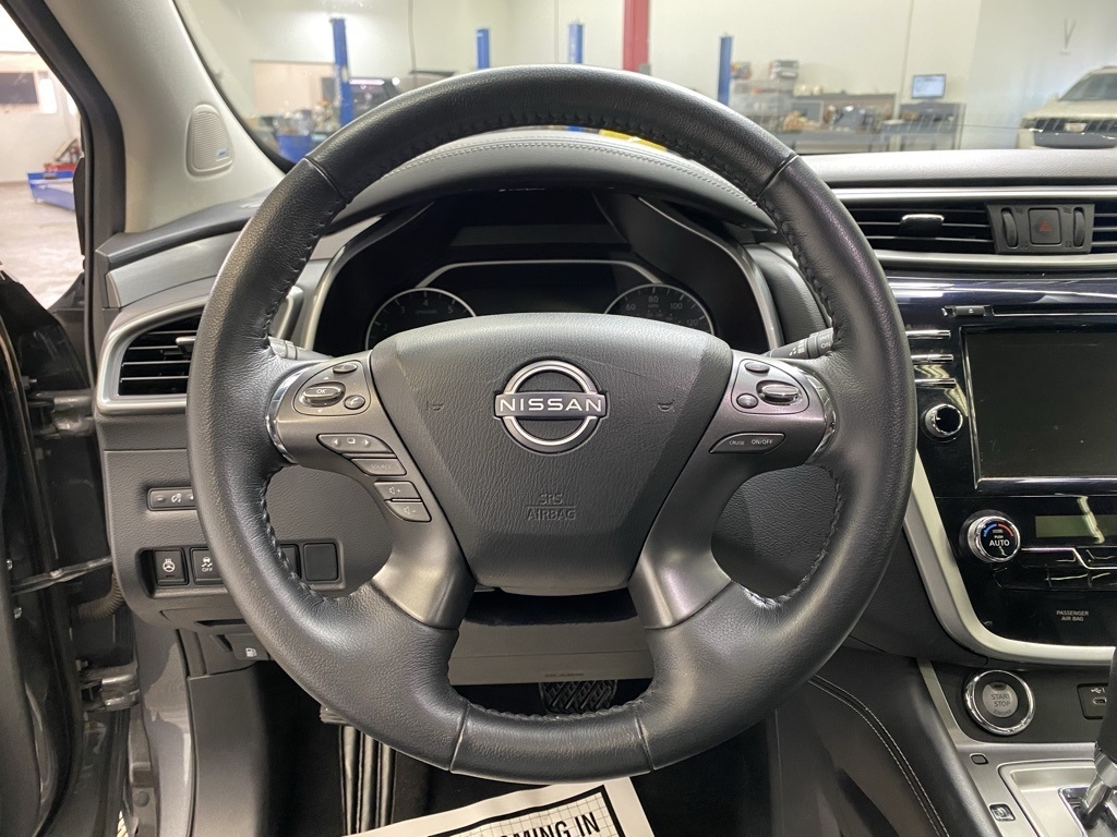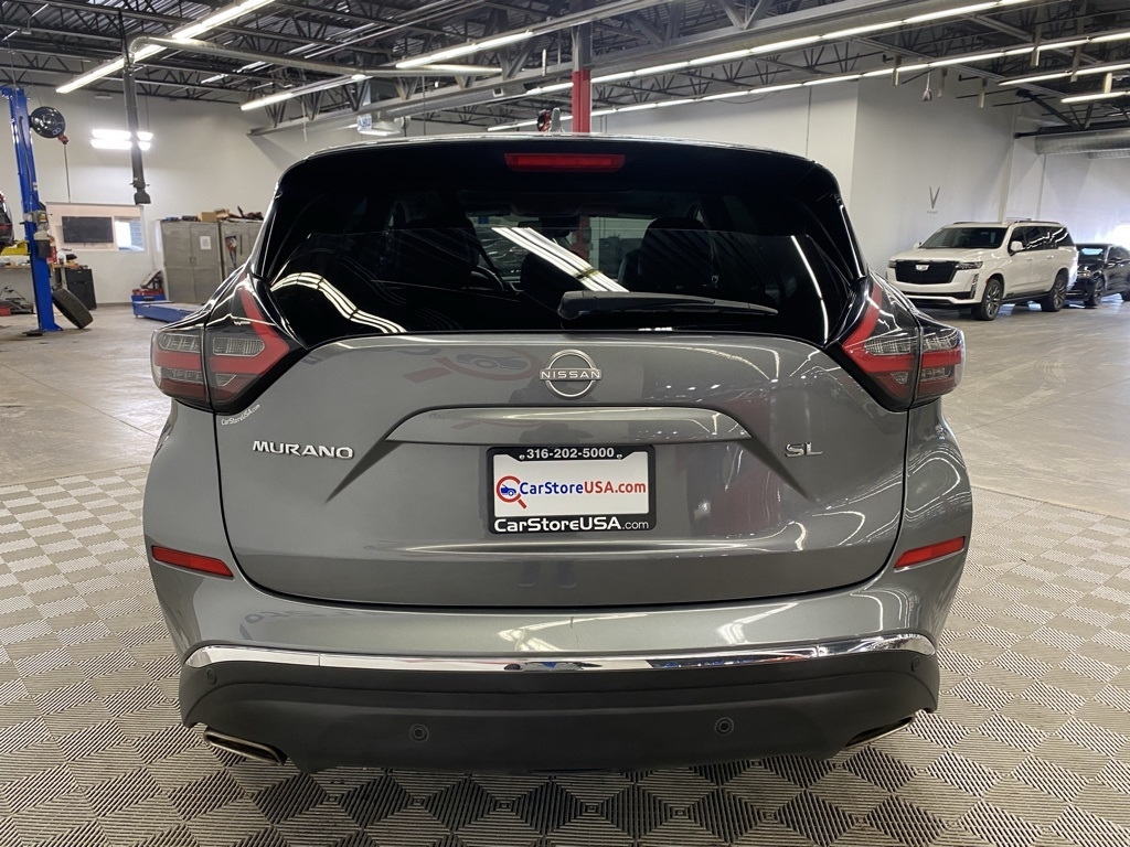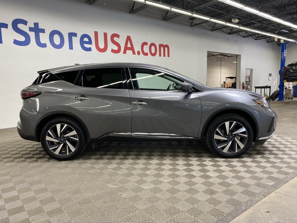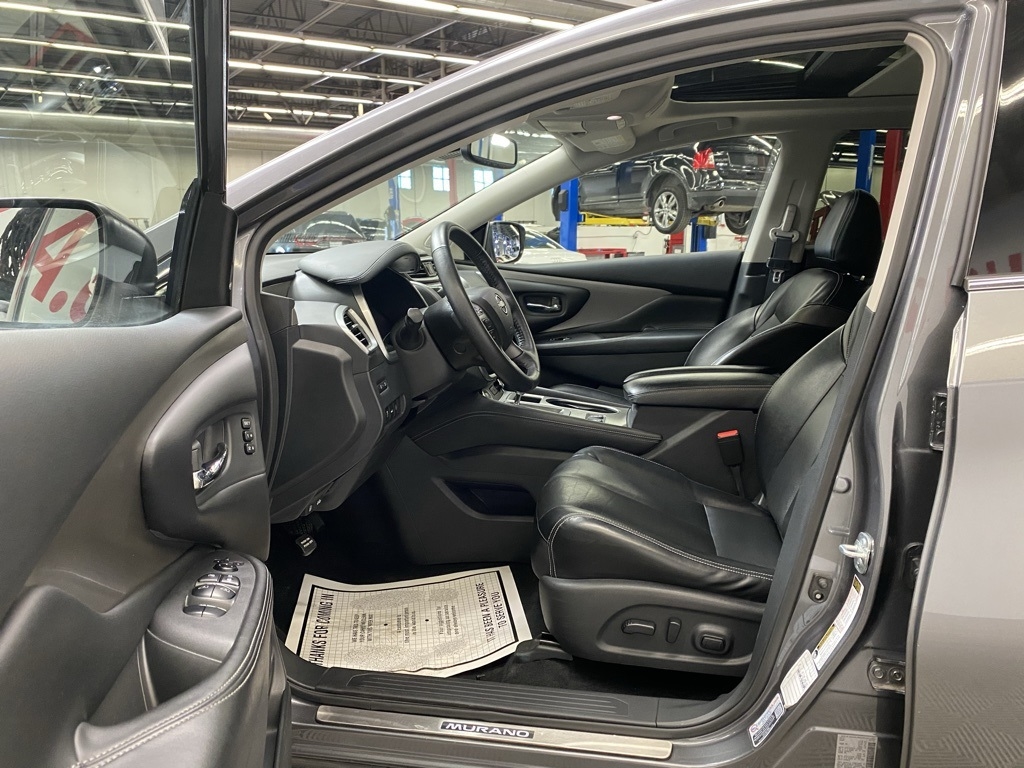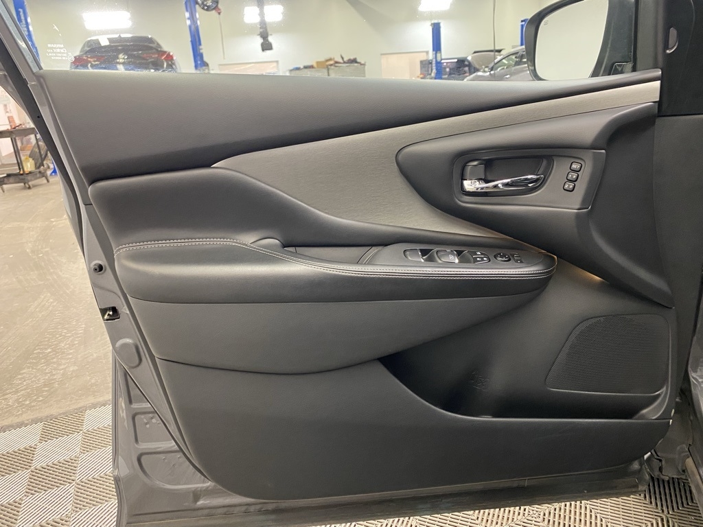 CARFAX One-Owner. THIS VEHICLE IS EQUIPPED WITH THE FOLLOWING FEATURES AND OPTIONS SL Moonroof Package (Dual-Panel Moonroof and Roof Rail Delete), 11 Speakers, 4-Wheel Disc Brakes, 4.667 Axle Ratio, ABS brakes, Air Conditioning, Alloy wheels, AM/FM radio: SiriusXM, AM/FM/CD/MP3/WMA Audio System, Auto High-beam Headlights, Auto-dimming Rear-View mirror, Automatic temperature control, Blind Spot Warning, Brake assist, Bumpers: body-color, Carpeted Floor Mats & Carpeted Cargo Mat, CD player, Child-Seat-Sensing Airbag, Delay-off headlights, Driver door bin, Driver vanity mirror, Dual front impact airbags, Dual front side impact airbags, Electronic Stability Control, Exterior Parking Camera Rear, Four wheel independent suspension, Front anti-roll bar, Front Bucket Seats, Front Center Armrest, Front dual zone A/C, Front fog lights, Front reading lights, Fully automatic headlights, Garage door transmitter: HomeLink, Heated door mirrors, Heated Front Bucket Seats, Heated front seats, Heated rear seats, Heated steering wheel, Illuminated entry, Illuminated Kick Plates, Illuminated Kick Plates (PIO), Knee airbag, Leather-Appointed Seat Trim, Low tire pressure warning, Memory seat, Navigation system: NissanConnect Navigation, NissanConnect featuring Apple CarPlay and Android Auto, Occupant sensing airbag, Outside temperature display, Overhead airbag, Overhead console, Panic alarm, Passenger door bin, Passenger vanity mirror, Power door mirrors, Power driver seat, Power Liftgate, Power passenger seat, Power steering, Power windows, Premium audio system: Bose, Radio data system, Rear anti-roll bar, Rear reading lights, Rear seat center armrest, Rear side impact airbag, Rear window defroster, Rear window wiper, Remote keyless entry, Security system, Speed control, Speed-sensing steering, Speed-Sensitive Wipers, Split folding rear seat, Spoiler, Steering wheel mounted audio controls, Tachometer, Telescoping steering wheel, Tilt steering wheel, Traction control, Trip computer, Turn signal indicator mirrors, Variably intermittent wipers, and Wheels: 20" Machined Aluminum-Alloy. Clean CARFAX. Gun Metallic 2023 Nissan Murano SL FWD CVT with Xtronic 3.5L V6 DOHC 24V