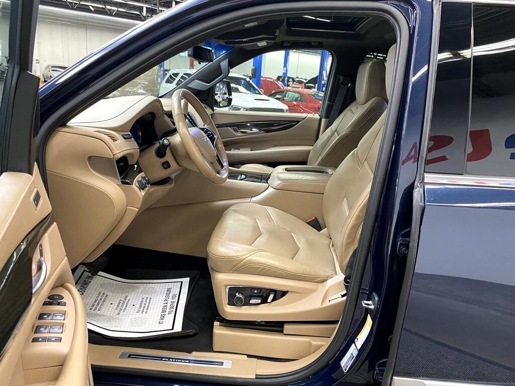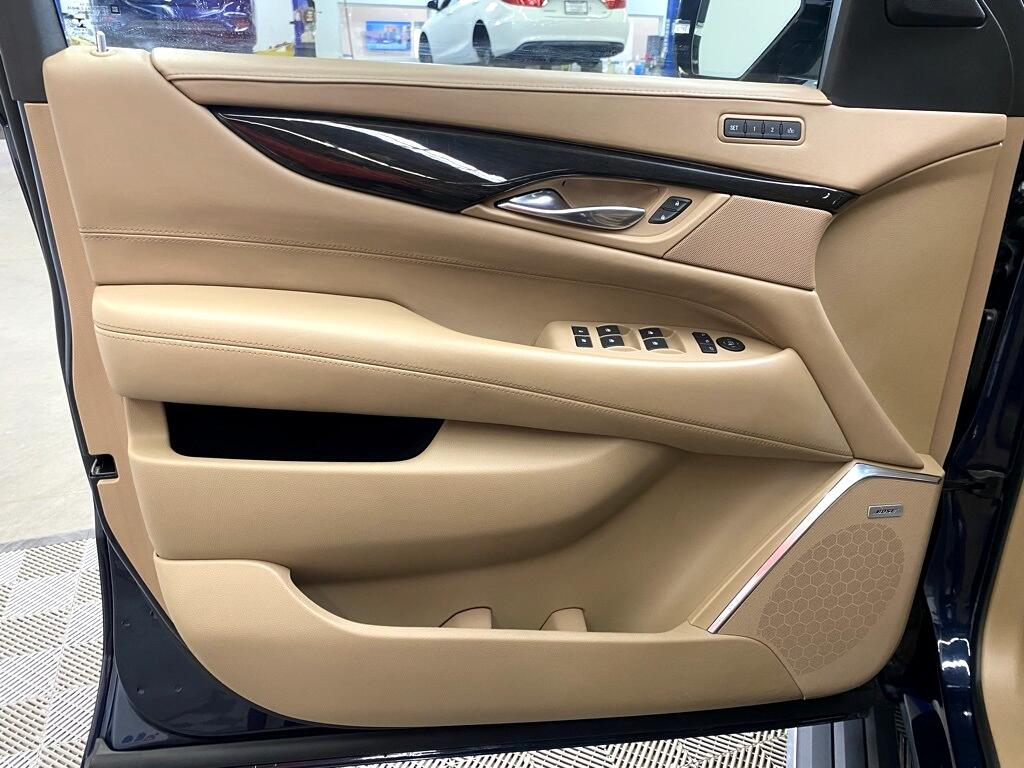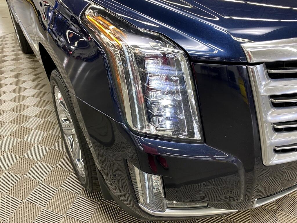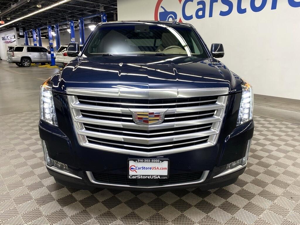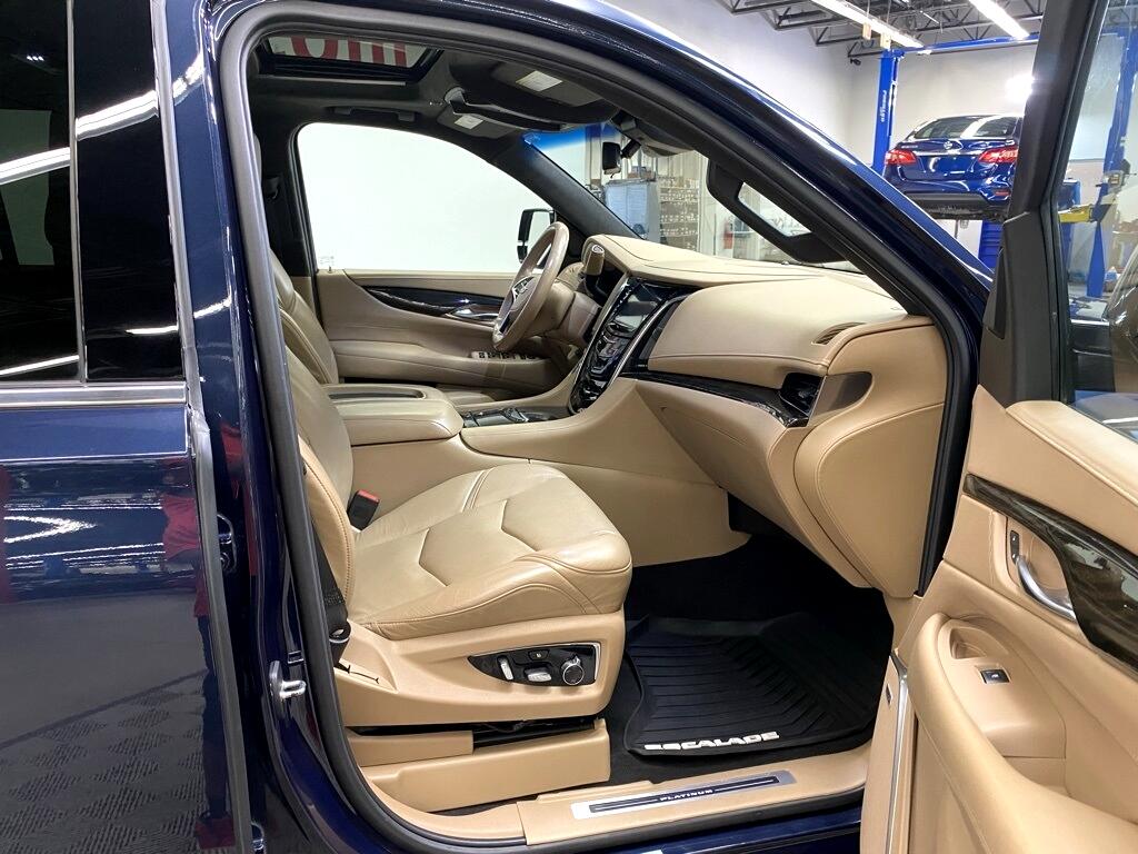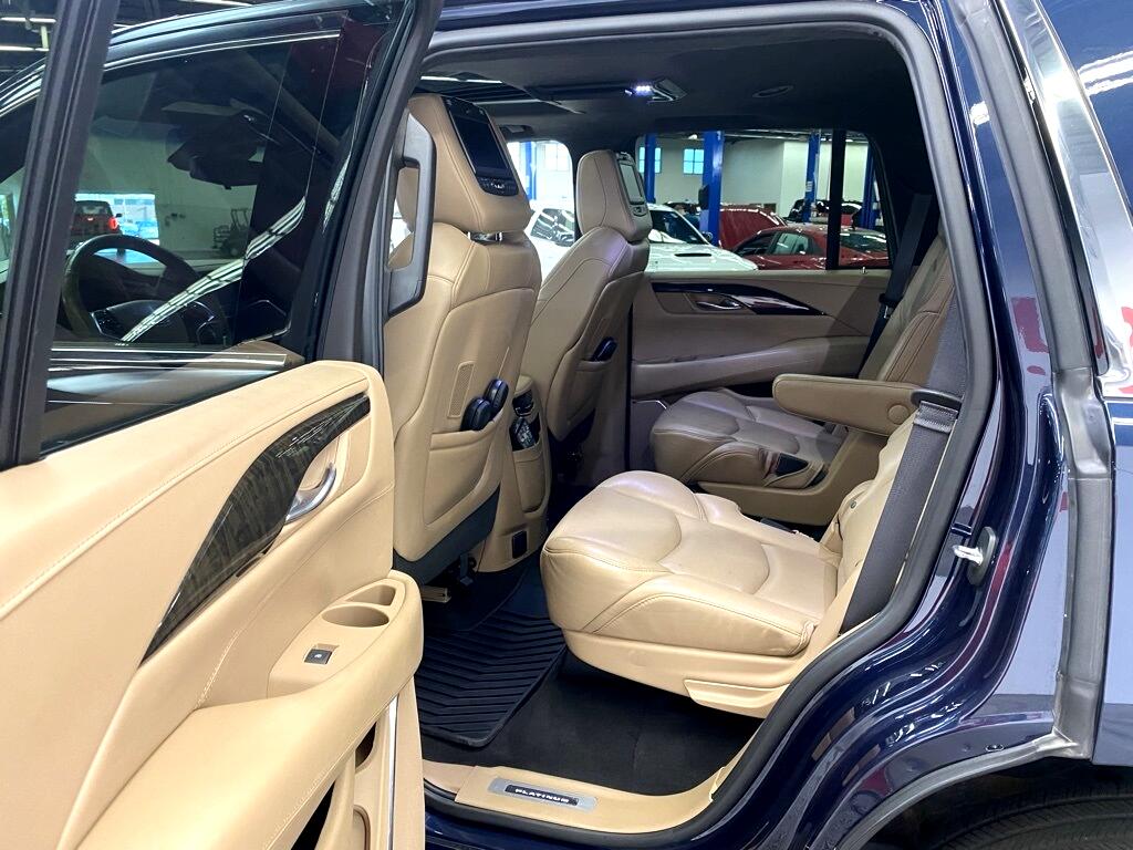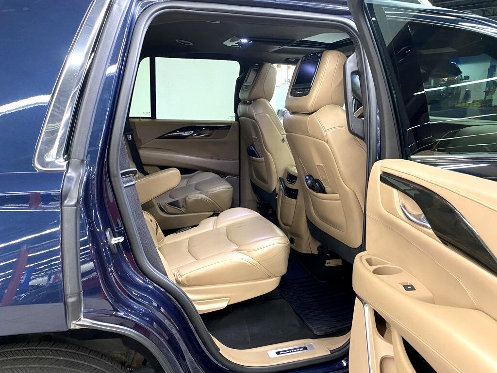 THIS VEHICLE IS EQUIPPED WITH THE FOLLOWING FEATURES AND OPTIONS Driver Assist Package (Adaptive Full-Speed Range Cruise Control, Automatic Safety Belt Tightening, Electronic Powered Parking Brake, and Forward/Reverse Automatic Braking), Interior Protection Package (LPO) (1st 2nd & 3rd Row All-Weather Floor Mats (LPO) and All-Weather Cargo Mat (LPO)), Platinum Package (Cooled Console w/Covered Storage, Dual DVD Screens, Leather Wrapped IP/Console/Door, Microfiber Sueded Headliner, Platinum Sill Plates, Premium Floor Mats, Sumi Black Tamo Ash Unique Exotic Wood, and Unique Grille Design), Preferred Equipment Group 1SD (Forward Collision Alert, Illuminated Door Handles, IntelliBeam Automatic High Beam On/Off, Lane Change Alert w/Side Blind Zone Alert, Lane Keep Assist w/Lane Departure Warning, Power Tilt-Sliding Sunroof w/Express-Open/Close, Power-Retractable Assist Steps, Rear Camera Mirror, Rear Camera Washer, Rear Cross-Traffic Alert, Rear Seat Entertainment System, Reconfigurable 4-Color Head-Up Display, Safety Alert Seat, Second Row Bucket Seats, and VAC Power 17" Disc Brakes), Theft-Deterrent Package (Inclination Sensor, Theft-Deterrent Alarm System, and Vehicle Interior Movement Sensor), 16 Speakers, 2-Position Memory For Driver's Seat Adjuster, 3.23 Axle Ratio, 3rd row seats: split-bench, 4-Wheel Disc Brakes, A/V remote, ABS brakes, Adaptive suspension, Adjustable pedals, Air Conditioning, Alloy wheels, AM/FM radio: SiriusXM, Apple CarPlay/Android Auto, Auto High-beam Headlights, Auto tilt-away steering wheel, Auto-dimming door mirrors, Auto-leveling suspension, Automatic temperature control, Black Front License Plate Bracket, Bodyside moldings, Bose Centerpoint 16 Speaker Surround Sound System, Brake assist, Bumpers: body-color, CD player, Compass, Delay-off headlights, Driver door bin, Driver vanity mirror, Dual front impact airbags, Dual front side impact airbags, DVD-Audio, Electronic Stability Control, Emergency communication system: OnStar and Cadillac connected services capable, Exterior Parking Camera Rear, Front anti-roll bar, Front Bucket Seats, Front Center Armrest w/Storage, Front dual zone A/C, Front reading lights, Front wheel independent suspension, Fully automatic headlights, Garage door transmitter, Genuine wood dashboard insert, HD Radio, Headphones, Heads-Up Display, Heated & Cooled Front Bucket Seats, Heated door mirrors, Heated front seats, Heated rear seats, Heated steering wheel, Illuminated entry, Leather Shift Knob, Leather steering wheel, Low tire pressure warning, Magnetic Ride Control Suspension, Memory seat, Navigation System, NavTraffic, Occupant sensing airbag, Outside temperature display, Overhead airbag, Overhead console, Panic alarm, Passenger door bin, Passenger vanity mirror, Pedal memory, Power door mirrors, Power driver seat, Power Liftgate, Power moonroof, Power passenger seat, Power steering, Power windows, Radio data system, Radio: AM/FM Cadillac User Experience w/Nav, Rain sensing wipers, Rear air conditioning, Rear anti-roll bar, Rear audio controls, Rear reading lights, Rear window defroster, Rear window wiper, Remote keyless entry, Roof rack: rails only, Security system, Semi-Aniline Leather Seating Surfaces, SiriusXM Satellite Radio, Speed control, Split folding rear seat, Spoiler, Steering wheel memory, Steering wheel mounted audio controls, Tachometer, Telescoping steering wheel, Tilt steering wheel, Traction control, Trip computer, Turn signal indicator mirrors, Variably intermittent wipers, Ventilated front seats, Wheel Locks, Wheels: 22" x 9" 6-Spoke Chrome, and Wheels: 22" x 9" Premium Painted w/Chrome Inserts. Clean CARFAX. Dark Adriatic Blue Metallic 2018 Cadillac Escalade Platinum Edition 4WD 10-Speed Automatic with Overdrive 6.2L Variable Valve Timing V8 SIDI