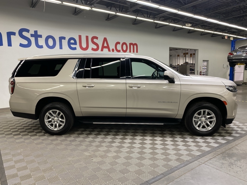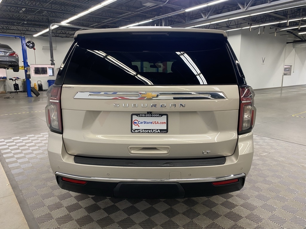 THIS VEHICLE IS EQUIPPED WITH THE FOLLOWING FEATURES AND OPTIONS Preferred Equipment Group 1LT (10-Way Power Driver & Passenger Seat Adjusters, 1st & 2nd Row Color-Keyed Carpeted Floor Mats, 2 USB Data Ports, Auto-Dimming Inside Rear-View Mirror, Bose 9-Speaker Stereo Audio System Feature, Bright Front & Rear Door Sill Plates, Color-Keyed Carpeting Floor Covering, Driver & Front Outboard Passenger Airbags, Floor Console w/Storage Area, Hands-Free Rear Power Programmable Liftgate, HD Radio, Heated Driver & Front Passenger Seats, Infotainment Display, Leather-Wrapped Steering Wheel, LED Daytime Running Lamps, Memory Settings For Driver, Remote Start, SiriusXM Radio w/360L, and Universal Home Remote), 3.23 Rear Axle Ratio, 3rd row seats: split-bench, 4-Wheel Disc Brakes, 9 Speakers, ABS brakes, Air Conditioning, Alloy wheels, AM/FM radio: SiriusXM with 360L, Apple CarPlay/Android Auto, Auto High-beam Headlights, Auto-dimming Rear-View mirror, Automatic temperature control, Brake assist, Bumpers: body-color, Compass, Delay-off headlights, Driver door bin, Driver vanity mirror, Dual front impact airbags, Dual front side impact airbags, Electronic Stability Control, Emergency communication system: OnStar and Chevrolet connected services capable, Four wheel independent suspension, Front anti-roll bar, Front Bucket Seats, Front Center Armrest, Front dual zone A/C, Front reading lights, Fully automatic headlights, Garage door transmitter, Heated door mirrors, Heated front seats, Illuminated entry, Leather Seating Surfaces, Leather steering wheel, Low tire pressure warning, Memory seat, Occupant sensing airbag, Outside temperature display, Overhead airbag, Overhead console, Panic alarm, Passenger door bin, Passenger vanity mirror, Power door mirrors, Power driver seat, Power Liftgate, Power passenger seat, Power steering, Power windows, Premium audio system: Chevrolet Infotainment 3 Plus, Premium Smooth Ride Suspension, Radio: Chevrolet Infotainment 3 Plus System, Rain sensing wipers, Rear air conditioning, Rear anti-roll bar, Rear reading lights, Rear seat center armrest, Rear window defroster, Rear window wiper, Remote keyless entry, Roof rack: rails only, Security system, Speed control, Speed-sensing steering, Split folding rear seat, Spoiler, Steering wheel mounted audio controls, Tachometer, Telescoping steering wheel, Tilt steering wheel, Traction control, Trip computer, Variably intermittent wipers, Voltmeter, and Wheels: 18" x 8.5" Bright Silver Painted Aluminum. Clean CARFAX. Empire Beige Metallic 2021 Chevrolet Suburban LT RWD 10-Speed Automatic with Overdrive EcoTec3 5.3L V8