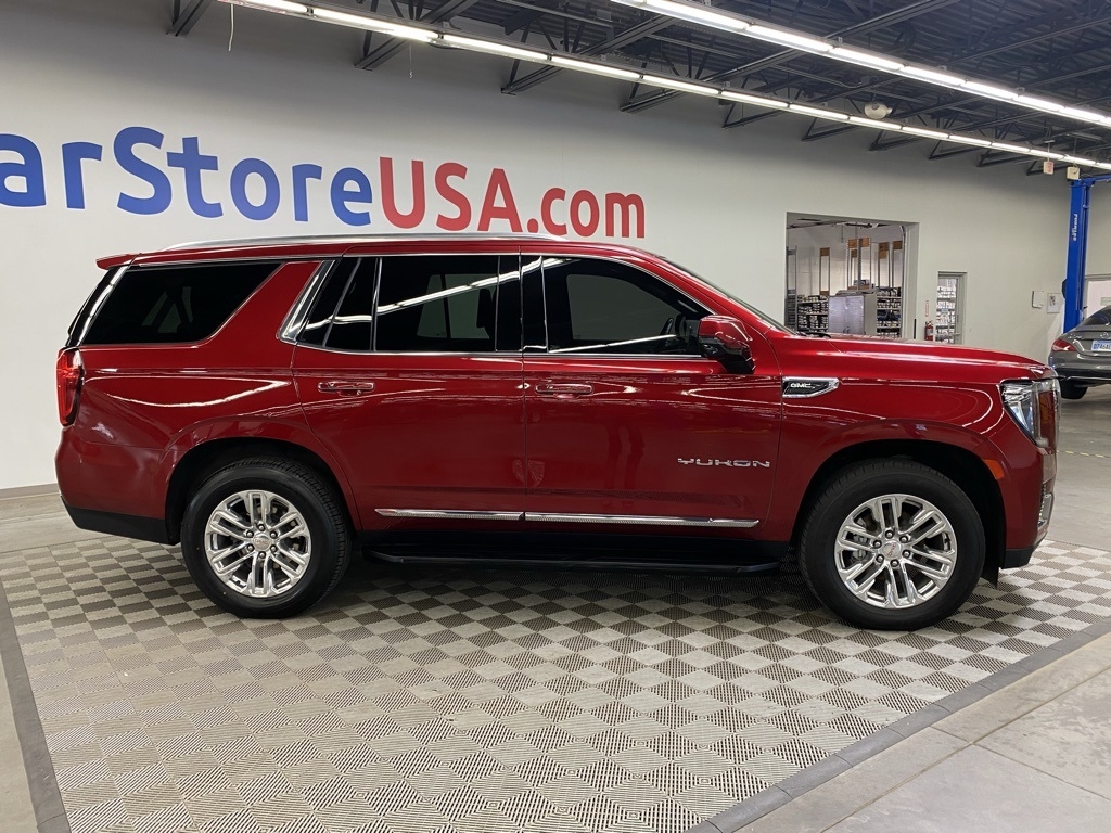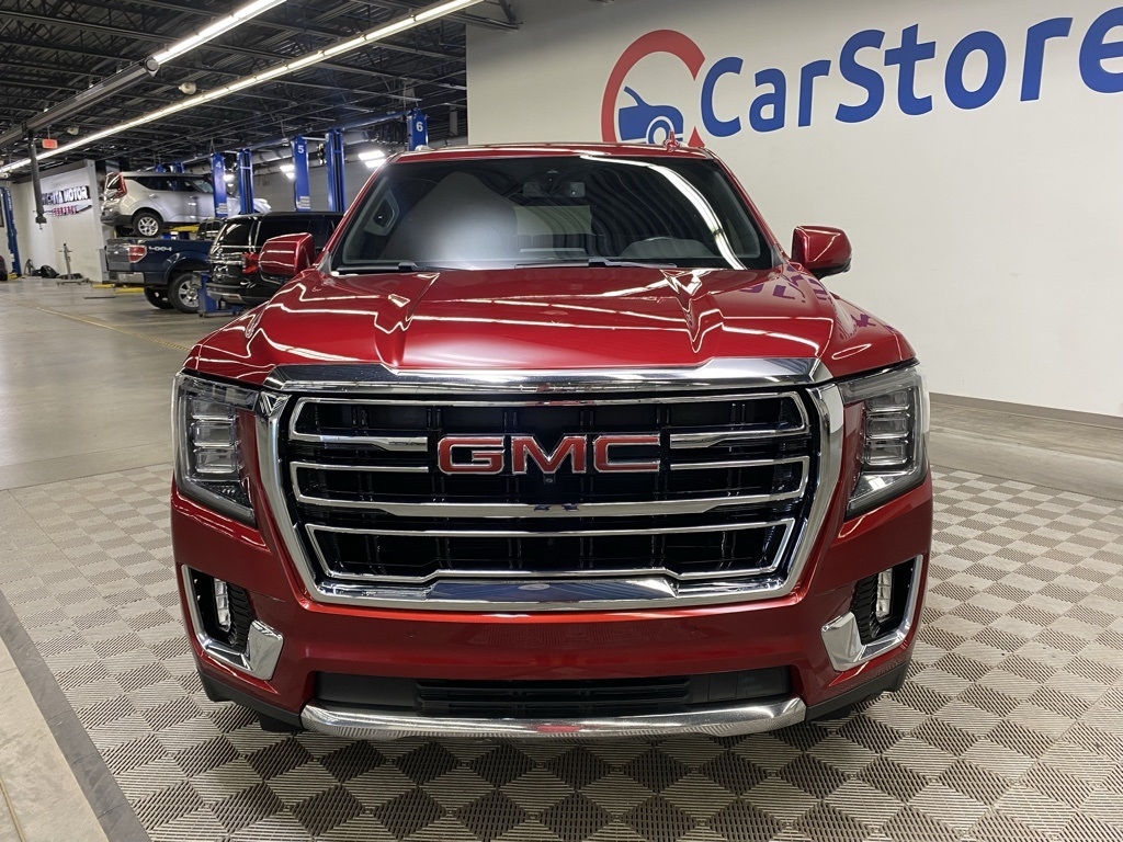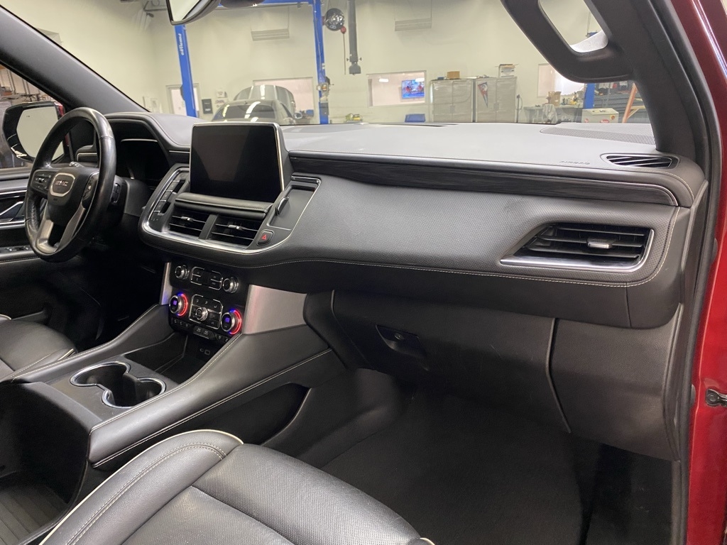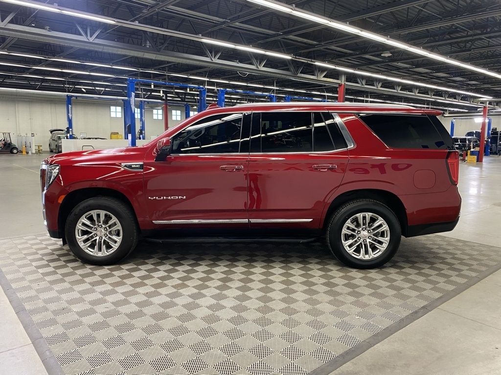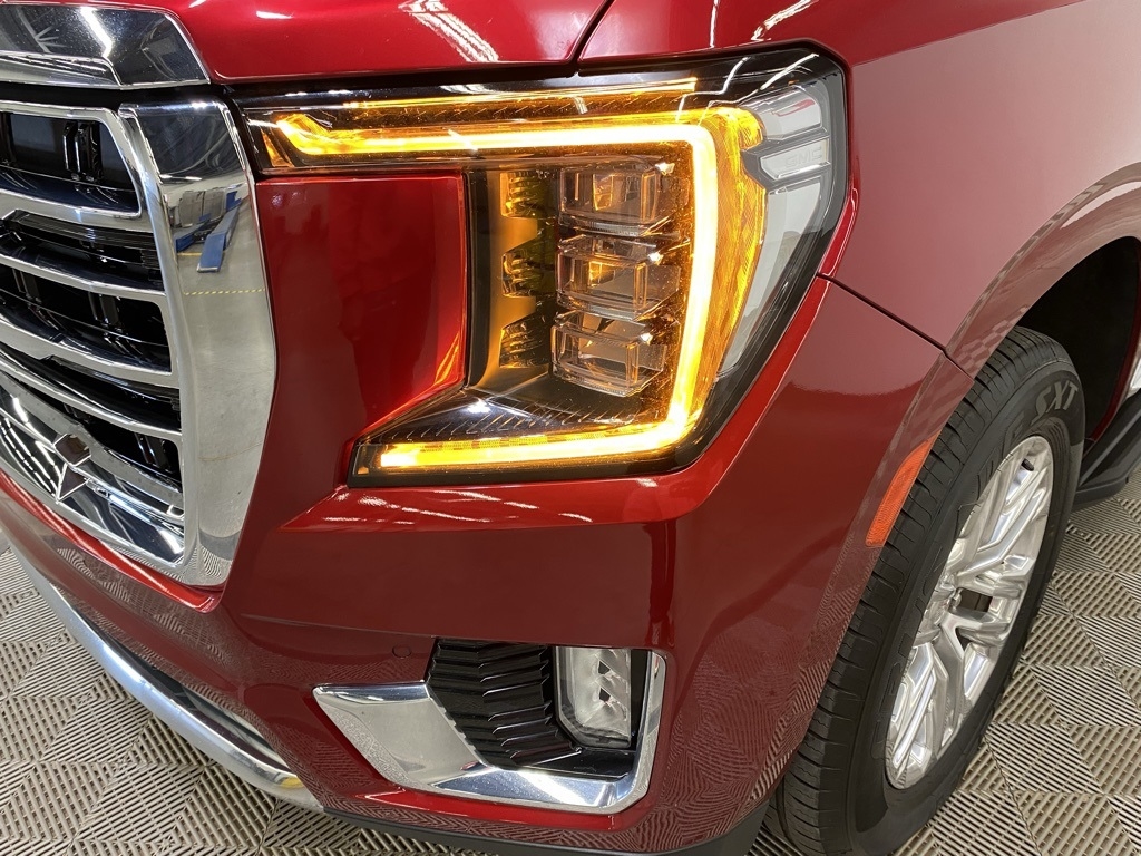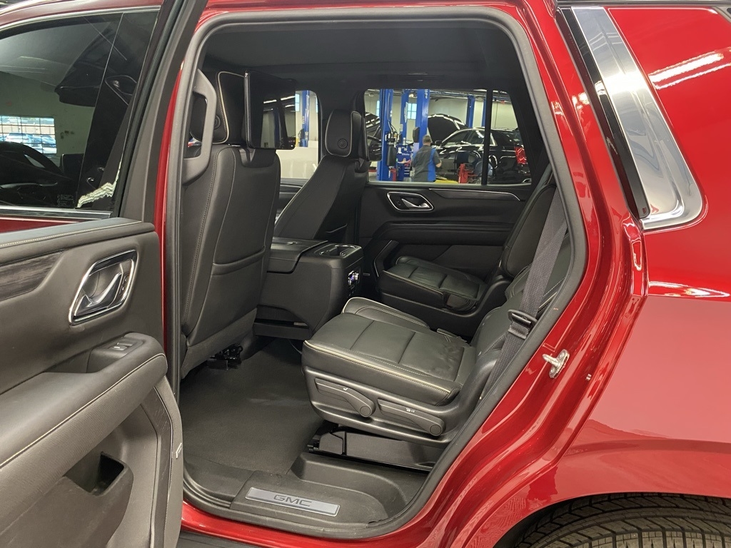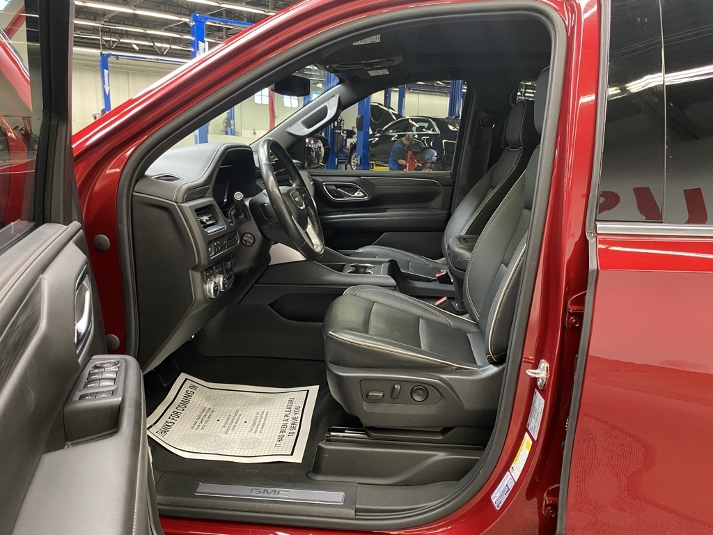 CARFAX One-Owner. THIS VEHICLE IS EQUIPPED WITH THE FOLLOWING FEATURES AND OPTIONS Max Trailering Package, Preferred Equipment Group 4SA (2 Presets For Power Driver Seat, Automatic Stop/Start, Bose 9-Speaker Stereo Audio System Feature, Bright Chrome Bodyside Moldings, Bright Front & Rear Door Sill Plates, Chrome Door Handles w/Body-Color Strip, Hands-Free Power Programmable Rear Liftgate, Heated & Ventilated Driver & Front Passenger Seats, Heated Driver & Front Passenger Seats, Inside Rear-View Auto-Dimming Mirror, Safety Alert Seat, Start/Stop System Disable Button, Universal Home Remote, and Wireless Charging), SLT Luxury Package (2 Presets For Outside Rearview Mirrors, 3rd Row 60/40 Power-Folding Split-Bench Seat, HD Surround Vision, Heated 2nd Row Outboard Position Seats, Heated Steering Wheel, Outside Heated Power-Adjustable Mirrors, Power Release 2nd Row 60/40 Split-Folding Bench Seat, Power Tilt & Telescopic Steering Column, and Rear Pedestrian Alert), SLT Premium Package (Dual-Pane Panoramic Power Sunroof), 3.23 Rear Axle Ratio, 3rd row seats: split-bench, 4-Wheel Disc Brakes, 9 Speakers, ABS brakes, Air Conditioning, Alloy wheels, AM/FM radio: SiriusXM with 360L, AM/FM Stereo, Apple CarPlay/Android Auto, Auto High-beam Headlights, Auto-dimming Rear-View mirror, Automatic Emergency Braking, Automatic temperature control, Bodyside moldings, Brake assist, Bumpers: body-color, Compass, Delay-off headlights, Driver door bin, Driver vanity mirror, Dual front impact airbags, Dual front side impact airbags, Electronic Stability Control, Emergency communication system: OnStar and GMC Connected Services capable, Extra Capacity Cooling System, Floor Console, Following Distance Indicator, Forward Collision Alert, Four wheel independent suspension, Front & Rear Park Assist, Front anti-roll bar, Front Bucket Seats, Front Center Armrest, Front dual zone A/C, Front fog lights, Front Pedestrian Braking, Front reading lights, Fully automatic headlights, Garage door transmitter, Heated door mirrors, Heated front seats, Hitch Guidance w/Hitch View, Illuminated entry, Integrated Trailer Brake Controller, IntelliBeam Automatic High Beam On/Off, Lane Change Alert w/Side Blind Zone Alert, Lane Keep Assist w/Lane Departure Warning, Leather steering wheel, Low tire pressure warning, Memory seat, Navigation System, Not Equipped w/4-Way Driver & Fr Pass Pwr Lumbar, Not Equipped w/Steering Column Lock, Occupant sensing airbag, Outside temperature display, Overhead airbag, Overhead console, Panic alarm, Passenger door bin, Passenger vanity mirror, Perforated Leather-Appointed Seating, Power door mirrors, Power driver seat, Power Liftgate, Power passenger seat, Power Release 2nd Row Bucket Seats, Power steering, Power windows, Premium Smooth Ride Suspension, Rain sensing wipers, Rear air conditioning, Rear anti-roll bar, Rear Cross Traffic Alert, Rear reading lights, Rear seat center armrest, Rear Seat Media System (DISC), Rear window defroster, Rear window wiper, Remote keyless entry, Roof rack: rails only, Security system, SiriusXM w/360L, Smart Trailer Integration Indicator, Speed control, Speed-sensing steering, Split folding rear seat, Spoiler, Steering wheel mounted audio controls, Tachometer, Telescoping steering wheel, Tilt steering wheel, Traction control, Trailer Side Blind Zone Alert, Trip computer, Variably intermittent wipers, Ventilated front seats, Voltmeter, and Wheels: 20" x 9" 6-Spoke Polished Aluminum. Clean CARFAX. Cayenne Red Tintcoat 2022 GMC Yukon SLT 4WD 10-Speed Automatic with Overdrive EcoTec3 5.3L V8