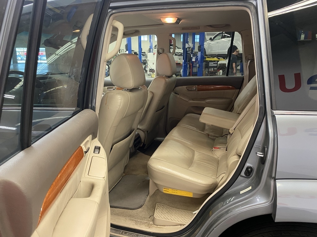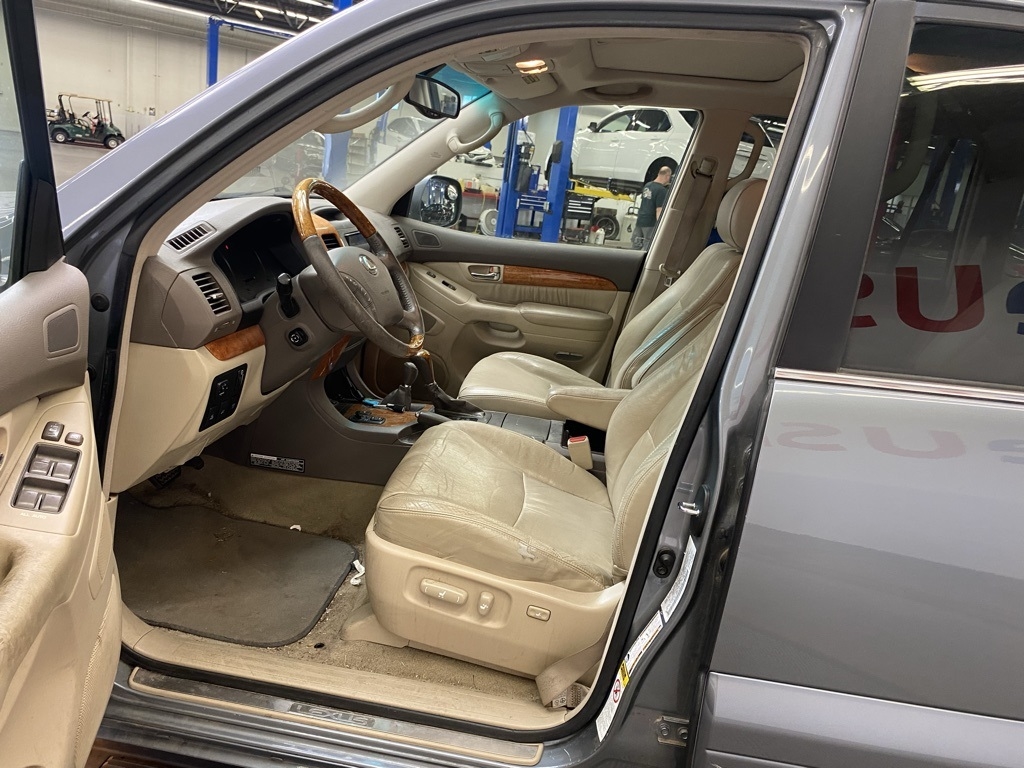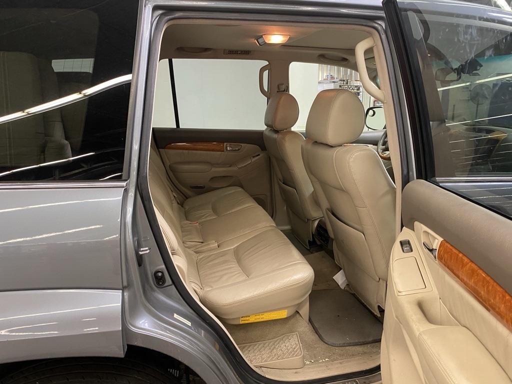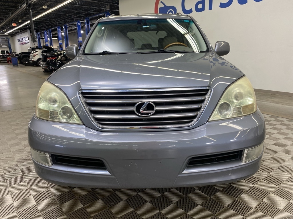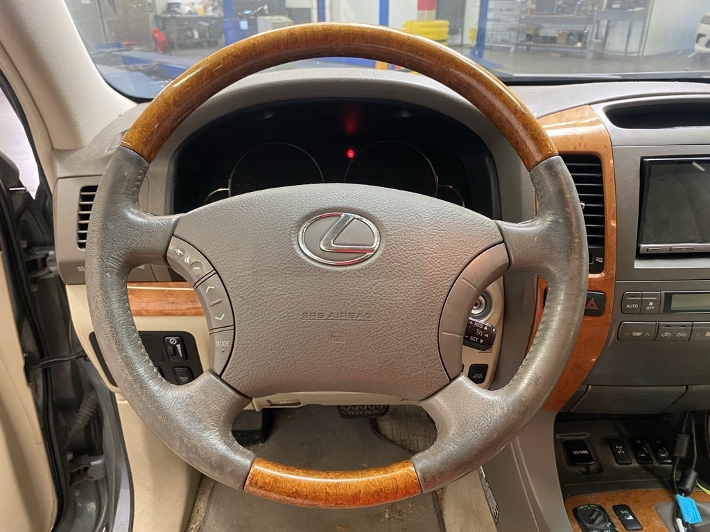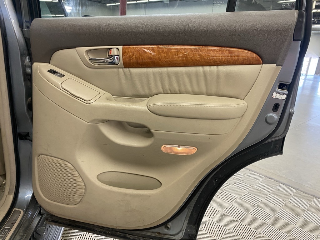 THIS VEHICLE IS EQUIPPED WITH THE FOLLOWING FEATURES AND OPTIONS 11 Speakers, 17" x 7.5" JJ Aluminum Alloy Wheels, 3.727 Axle Ratio, 4-Wheel Disc Brakes, ABS brakes, Adaptive suspension, Air Conditioning, Alloy wheels, AM/FM radio, Auto tilt-away steering wheel, Auto-dimming Rear-View mirror, Auto-leveling suspension, Automatic temperature control, Brake assist, Bumpers: body-color, Cassette, CD player, Compass, Delay-off headlights, Driver door bin, Driver vanity mirror, Driver's Seat Mounted Armrest, Dual front impact airbags, Dual front side impact airbags, Electronic Stability Control, Front anti-roll bar, Front Bucket Seats, Front dual zone A/C, Front fog lights, Front reading lights, Front wheel independent suspension, Fully automatic headlights, Garage door transmitter: HomeLink, Genuine wood console insert, Genuine wood dashboard insert, Genuine wood door panel insert, Heated door mirrors, Heated Front Bucket Seats, Heated front seats, Illuminated entry, Illuminated running boards, Leather Seat Trim, Leather Shift Knob, Leather steering wheel, Low tire pressure warning, Memory seat, Outside temperature display, Overhead airbag, Overhead console, Panic alarm, Passenger door bin, Passenger seat mounted armrest, Passenger vanity mirror, Power door mirrors, Power driver seat, Power moonroof, Power passenger seat, Power steering, Power windows, Premium ETR AM/FM Stereo w/6-Disc CD, Rain sensing wipers, Rear anti-roll bar, Rear audio controls, Rear seat center armrest, Rear window defroster, Rear window wiper, Remote keyless entry, Roof rack, Security system, Speed control, Speed-sensing steering, Split folding rear seat, Steering wheel memory, Steering wheel mounted audio controls, Tachometer, Telescoping steering wheel, Tilt steering wheel, Traction control, Trip computer, and Variably intermittent wipers. Silver 2004 Lexus GX 470 4WD 5-Speed Automatic with Overdrive 4.7L V8 SMPI DOHC