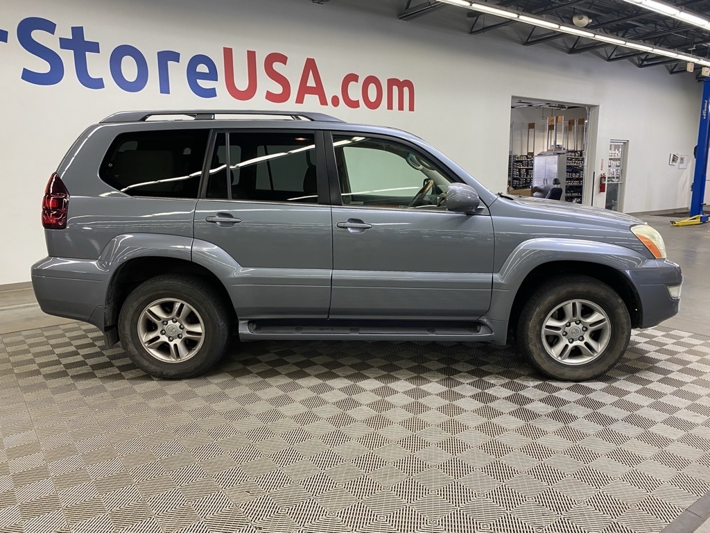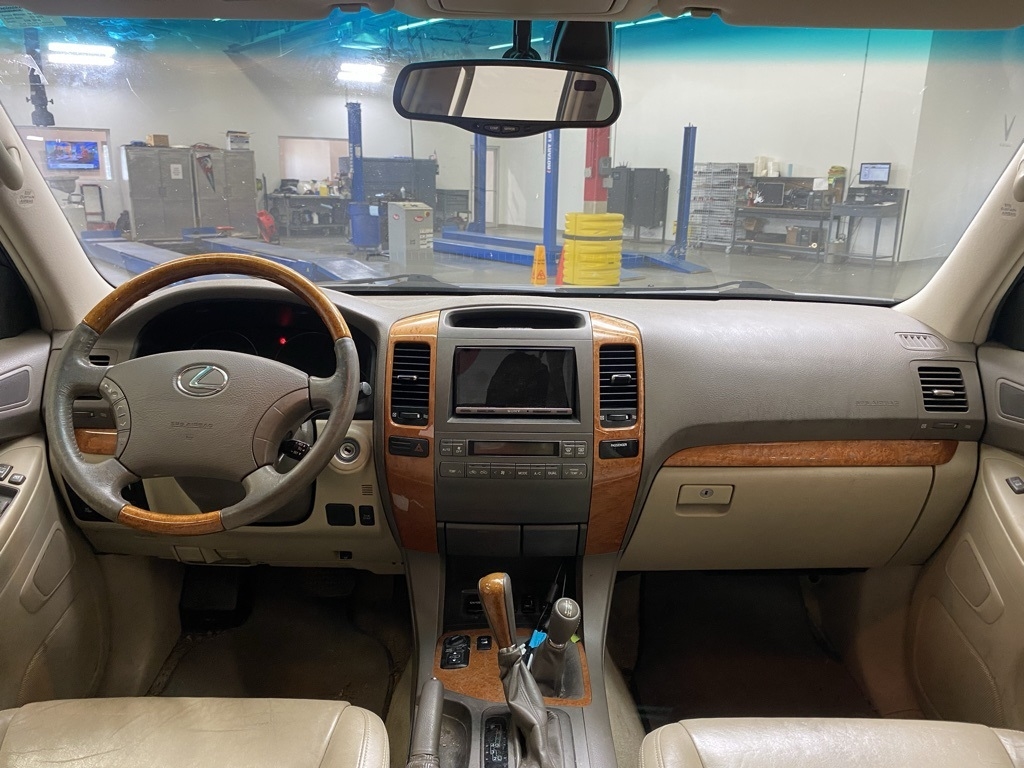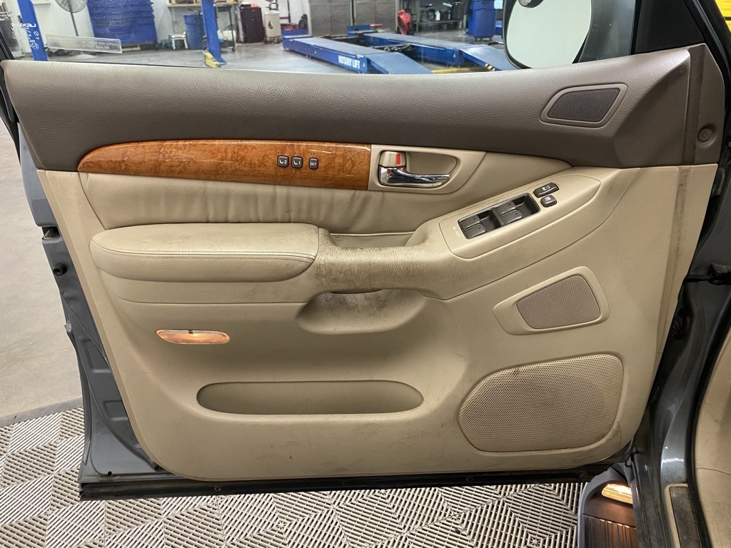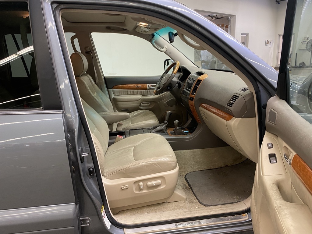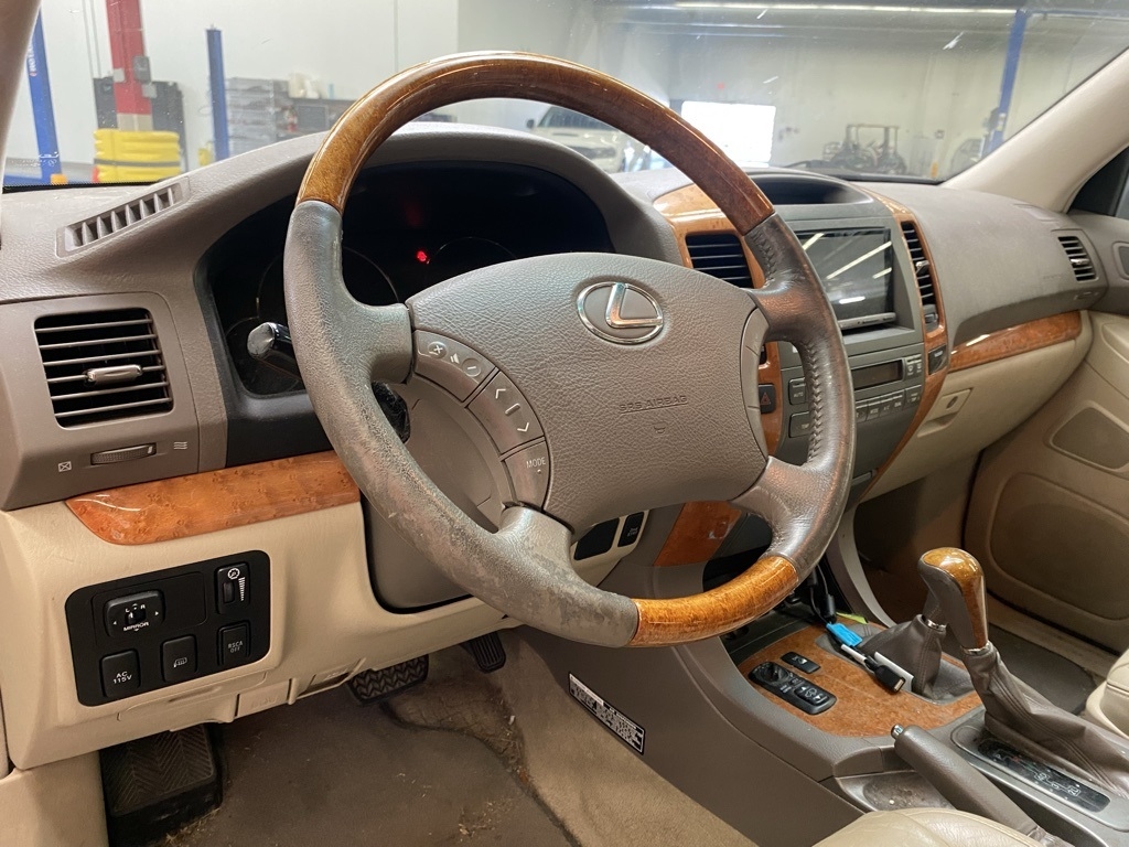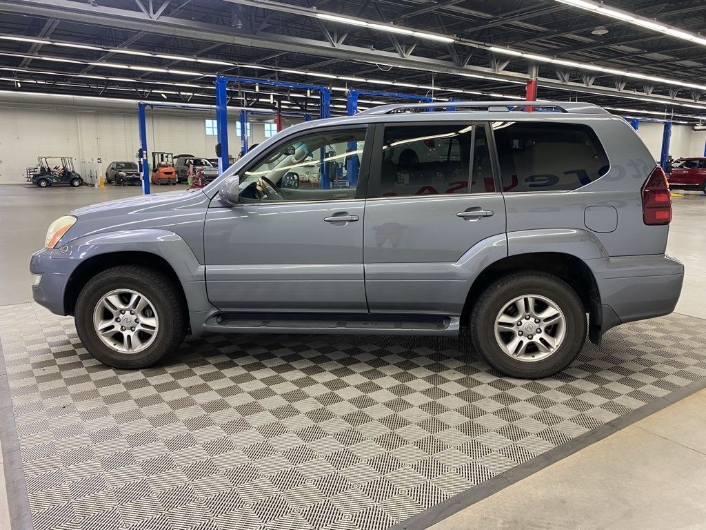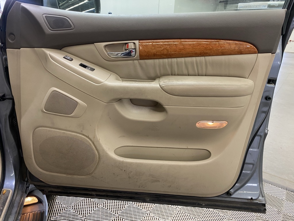 THIS VEHICLE IS EQUIPPED WITH THE FOLLOWING FEATURES AND OPTIONS 11 Speakers, 17" x 7.5" JJ Aluminum Alloy Wheels, 3.727 Axle Ratio, 4-Wheel Disc Brakes, ABS brakes, Adaptive suspension, Air Conditioning, Alloy wheels, AM/FM radio, Auto tilt-away steering wheel, Auto-dimming Rear-View mirror, Auto-leveling suspension, Automatic temperature control, Brake assist, Bumpers: body-color, Cassette, CD player, Compass, Delay-off headlights, Driver door bin, Driver vanity mirror, Driver's Seat Mounted Armrest, Dual front impact airbags, Dual front side impact airbags, Electronic Stability Control, Front anti-roll bar, Front Bucket Seats, Front dual zone A/C, Front fog lights, Front reading lights, Front wheel independent suspension, Fully automatic headlights, Garage door transmitter: HomeLink, Genuine wood console insert, Genuine wood dashboard insert, Genuine wood door panel insert, Heated door mirrors, Heated Front Bucket Seats, Heated front seats, Illuminated entry, Illuminated running boards, Leather Seat Trim, Leather Shift Knob, Leather steering wheel, Low tire pressure warning, Memory seat, Outside temperature display, Overhead airbag, Overhead console, Panic alarm, Passenger door bin, Passenger seat mounted armrest, Passenger vanity mirror, Power door mirrors, Power driver seat, Power moonroof, Power passenger seat, Power steering, Power windows, Premium ETR AM/FM Stereo w/6-Disc CD, Rain sensing wipers, Rear anti-roll bar, Rear audio controls, Rear seat center armrest, Rear window defroster, Rear window wiper, Remote keyless entry, Roof rack, Security system, Speed control, Speed-sensing steering, Split folding rear seat, Steering wheel memory, Steering wheel mounted audio controls, Tachometer, Telescoping steering wheel, Tilt steering wheel, Traction control, Trip computer, and Variably intermittent wipers. Silver 2004 Lexus GX 470 4WD 5-Speed Automatic with Overdrive 4.7L V8 SMPI DOHC