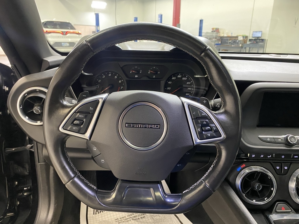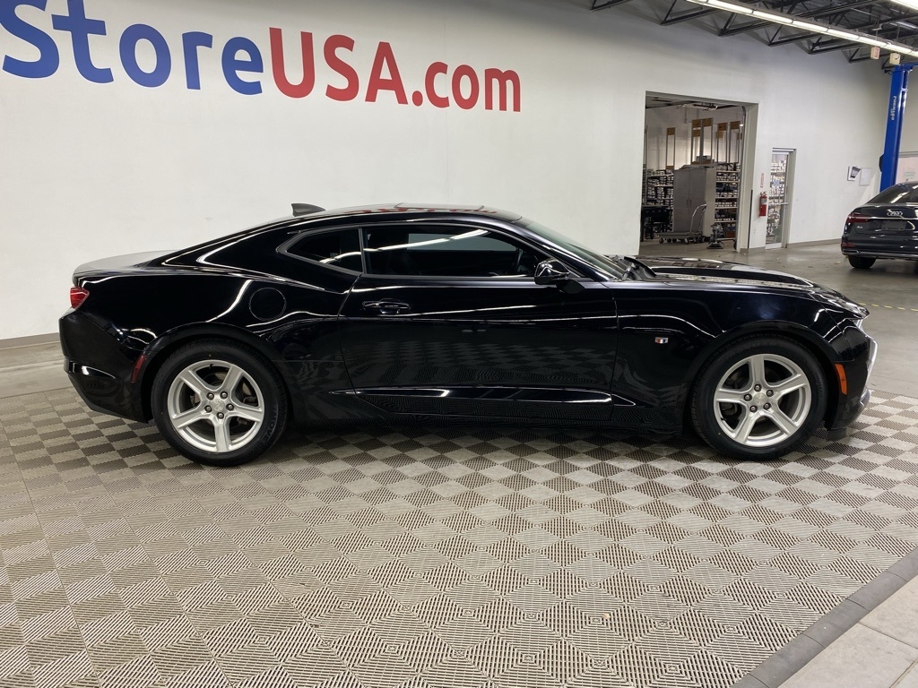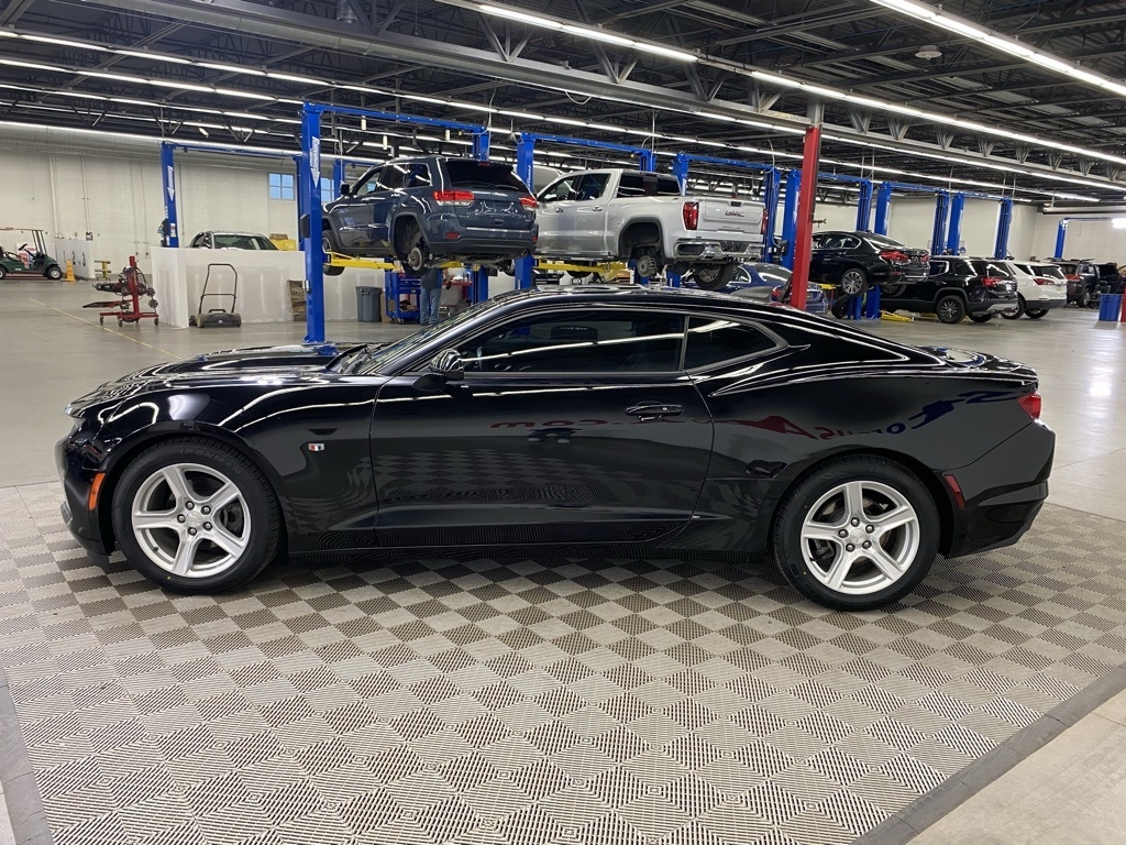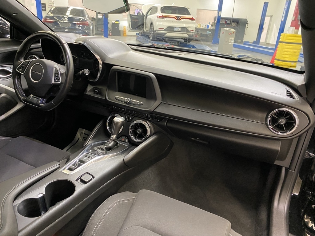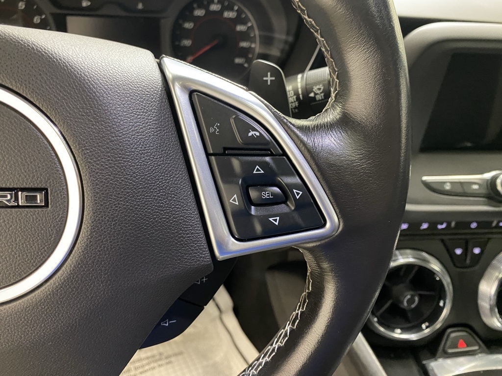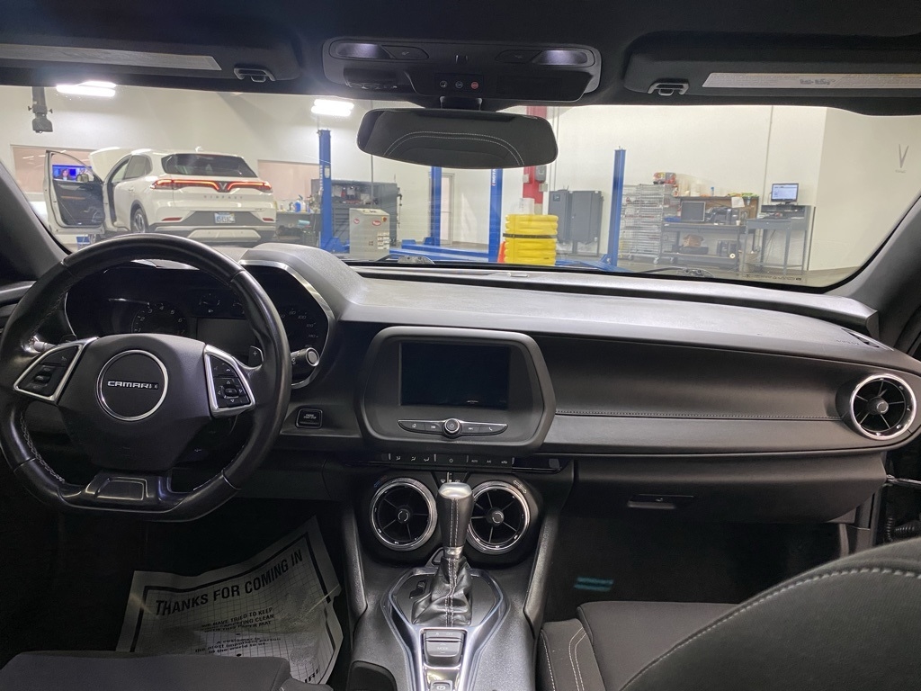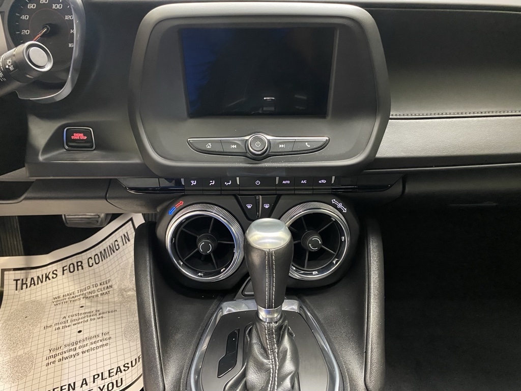 THIS VEHICLE IS EQUIPPED WITH THE FOLLOWING FEATURES AND OPTIONS 4-Wheel Disc Brakes, 6 Speakers, 6-Speaker Audio System Feature, 8-Way Power Driver Seat Adjuster, ABS brakes, Air Conditioning, Alloy wheels, Apple CarPlay/Android Auto, Automatic temperature control, Bluetooth® For Phone, Brake assist, Bumpers: body-color, Cloth Seat Trim, Compass, Delay-off headlights, Driver door bin, Driver vanity mirror, Dual front impact airbags, Dual front side impact airbags, Electronic Stability Control, Exterior Parking Camera Rear, Four wheel independent suspension, Front anti-roll bar, Front Bucket Seats, Front Center Armrest, Front License Plate Bracket, Front reading lights, Front Sport Bucket Seats, Fully automatic headlights, Illuminated entry, Knee airbag, Leather Shift Knob, Low tire pressure warning, Occupant sensing airbag, Overhead airbag, Paddle-Shift Manual Controls, Panic alarm, Passenger door bin, Passenger vanity mirror, Power door mirrors, Power driver seat, Power passenger seat, Power steering, Power windows, Premium audio system: Chevrolet Infotainment System, Radio data system, Radio: Chevrolet Infotainment 3 System, Rear anti-roll bar, Rear window defroster, Remote keyless entry, Remote Vehicle Starter System, Security system, Speed control, Speed-sensing steering, Steering wheel mounted audio controls, Tachometer, Telescoping steering wheel, Tilt steering wheel, Tire Inflation Kit, Traction control, Trip computer, Variably intermittent wipers, and Voltmeter. Black 2019 Chevrolet Camaro 1LT RWD 8-Speed Automatic 2.0L Turbocharged