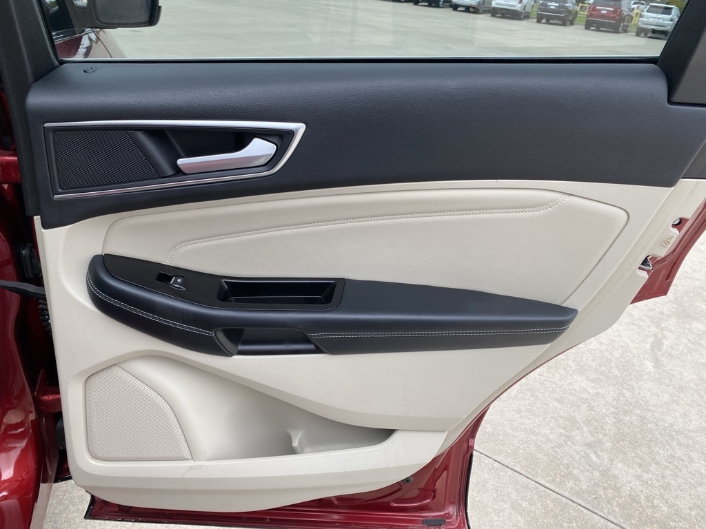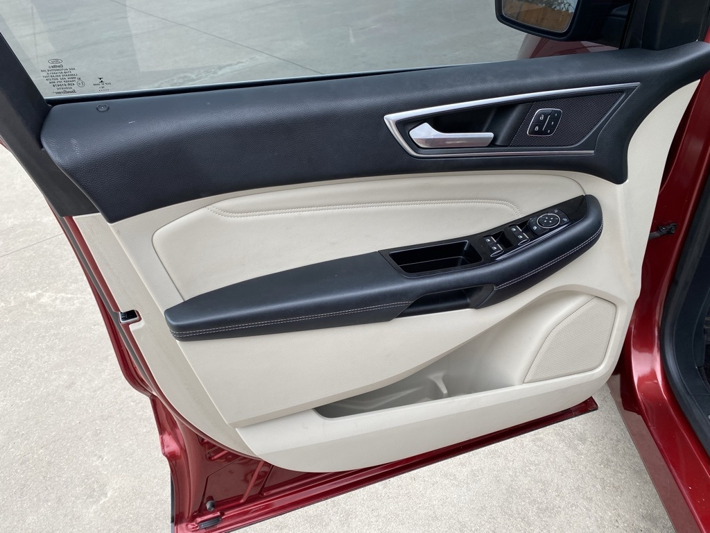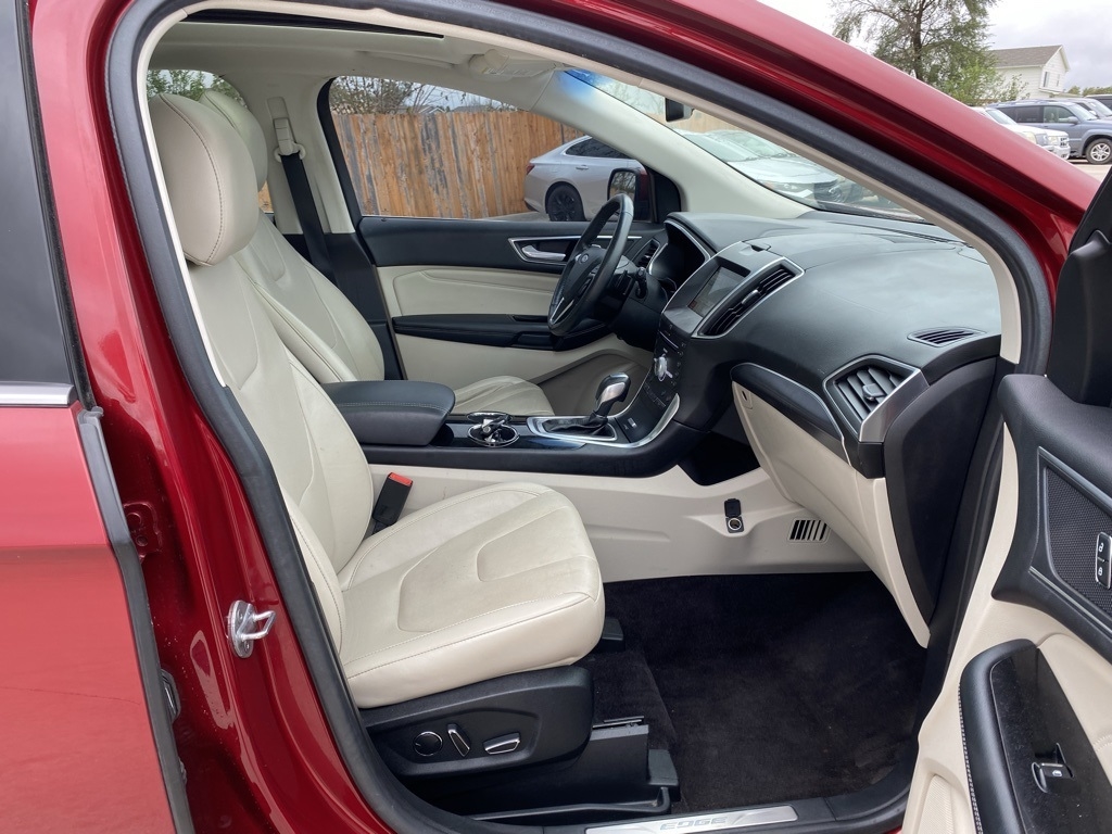 THIS VEHICLE IS EQUIPPED WITH THE FOLLOWING FEATURES AND OPTIONS Equipment Group 301A (Heated Rear-Seats, Panoramic Vista Roof, and Perforated Leather Trimmed Heated/Cooled Buckets), Technology Package (110V/400W AC Power Outlet, Auto-Dimming Driver's Sideview Mirror, BLIS Blind Spot Information System, Radio: AM/FM Stereo w/Single CD/Navigation, Remote Start System, SiriusXM Radio, and SiriusXM Traffic & Travel Link), 12 Speakers, 4-Wheel Disc Brakes, ABS brakes, Air Conditioning, Alloy wheels, AM/FM radio: SiriusXM, AM/FM Stereo w/Single CD Player, Auto-dimming Rear-View mirror, Automatic temperature control, Axle Ratio: TBD, Brake assist, Bumpers: body-color, CD player, Compass, Delay-off headlights, Driver door bin, Driver vanity mirror, Dual front impact airbags, Dual front side impact airbags, Electronic Stability Control, Emergency communication system: SYNC 3 911 Assist, Exterior Parking Camera Rear, Four wheel independent suspension, Front anti-roll bar, Front Bucket Seats, Front Center Armrest w/Storage, Front dual zone A/C, Front License Plate Bracket, Front reading lights, Fully automatic headlights, Garage door transmitter, Heated door mirrors, Heated front seats, Illuminated entry, Knee airbag, Leather Shift Knob, Leather-Trimmed Heated Sport Bucket Seats, Low tire pressure warning, Memory seat, Occupant sensing airbag, Outside temperature display, Overhead airbag, Overhead console, Panic alarm, Passenger door bin, Passenger vanity mirror, Power door mirrors, Power driver seat, Power Liftgate, Power passenger seat, Power steering, Power windows, Premium audio system: Sony, Rear anti-roll bar, Rear Parking Sensors, Rear reading lights, Rear seat center armrest, Rear window defroster, Rear window wiper, Remote keyless entry, Security system, Speed control, Speed-Sensitive Wipers, Split folding rear seat, Spoiler, Steering wheel mounted audio controls, SYNC 3, Tachometer, Telescoping steering wheel, Tilt steering wheel, Traction control, Trip computer, Turn signal indicator mirrors, Variably intermittent wipers, Wheels: 19" Nickel-Painted Aluminum, and Wheels: 20" Premium Polished Aluminum. Ruby Red Metallic 2017 Ford Edge Titanium AWD 6-Speed Automatic 3.5L V6 Ti-VCT