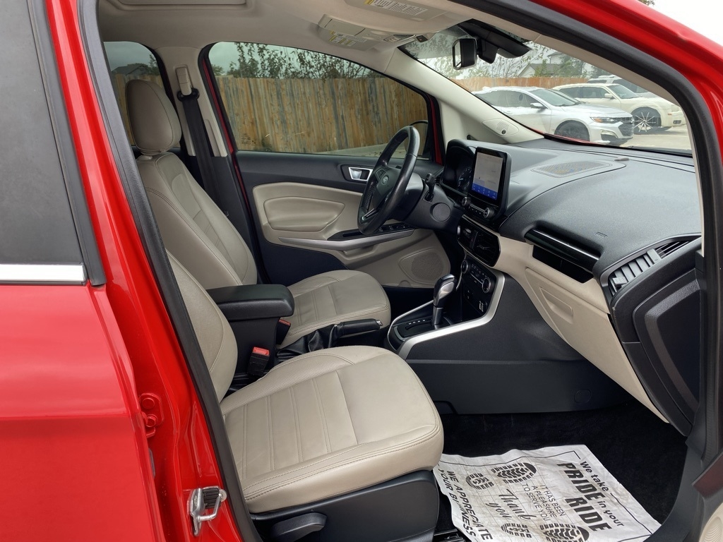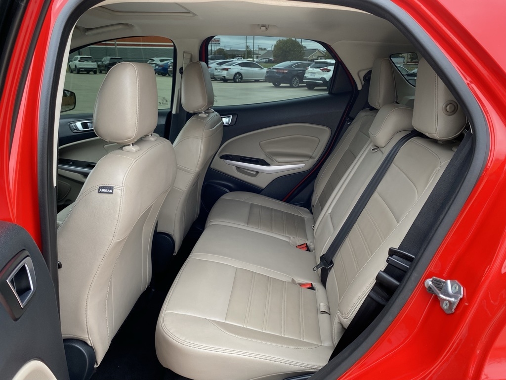 THIS VEHICLE IS EQUIPPED WITH THE FOLLOWING FEATURES AND OPTIONS Equipment Group 400A, 10 Speakers, 3.51 Axle Ratio, 4-Wheel Disc Brakes, ABS brakes, Air Conditioning, Alloy wheels, AM/FM radio: SiriusXM, AppLink/Apple CarPlay and Android Auto, Auto-dimming Rear-View mirror, Automatic temperature control, Brake assist, Bumpers: body-color, Compass, Delay-off headlights, Driver door bin, Driver vanity mirror, Dual front impact airbags, Dual front side impact airbags, Electronic Stability Control, Emergency communication system: SYNC 3 911 Assist, Exterior Parking Camera Rear, Front anti-roll bar, Front Bucket Seats, Front Center Armrest, Front fog lights, Front reading lights, Front wheel independent suspension, Fully automatic headlights, Heated door mirrors, Heated front seats, Heated steering wheel, Illuminated entry, Knee airbag, Leather Shift Knob, Leather steering wheel, Low tire pressure warning, Navigation System, Occupant sensing airbag, Outside temperature display, Overhead airbag, Overhead console, Panic alarm, Passenger door bin, Passenger vanity mirror, Perforated Leather-Trimmed Heated Bucket Seats, Power door mirrors, Power driver seat, Power moonroof, Power steering, Power windows, Radio data system, Radio: AM/FM Stereo w/MP3 Capable, Rain sensing wipers, Rear anti-roll bar, Rear Parking Sensors, Rear seat center armrest, Rear side impact airbag, Rear window defroster, Rear window wiper, Remote keyless entry, Roof rack: rails only, Security system, SiriusXM Radio, SiriusXM Traffic & Travel Link, Speed control, Speed-sensing steering, Split folding rear seat, Steering wheel mounted audio controls, SYNC 3 Communications & Entertainment System, Tachometer, Telescoping steering wheel, Tilt steering wheel, Traction control, Trip computer, Turn signal indicator mirrors, Variably intermittent wipers, and Wheels: 17" Premium Dark Stainless-Painted. Clean CARFAX. Race Red 2020 Ford EcoSport Titanium 4WD 6-Speed Automatic 2.0L I4 Ti-VCT GDI
