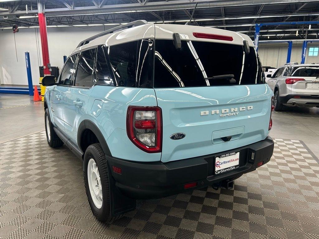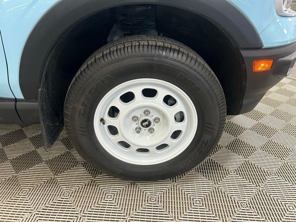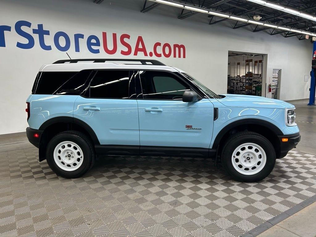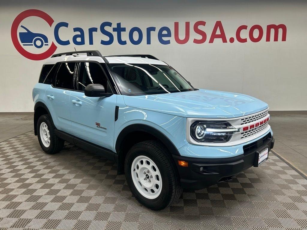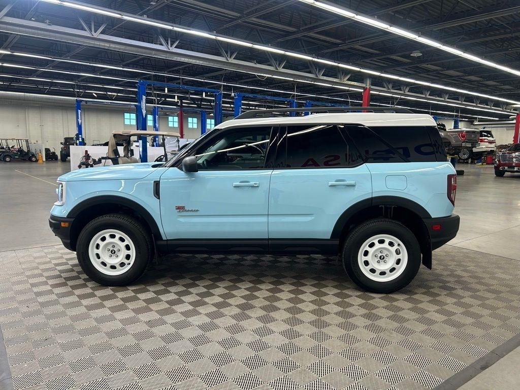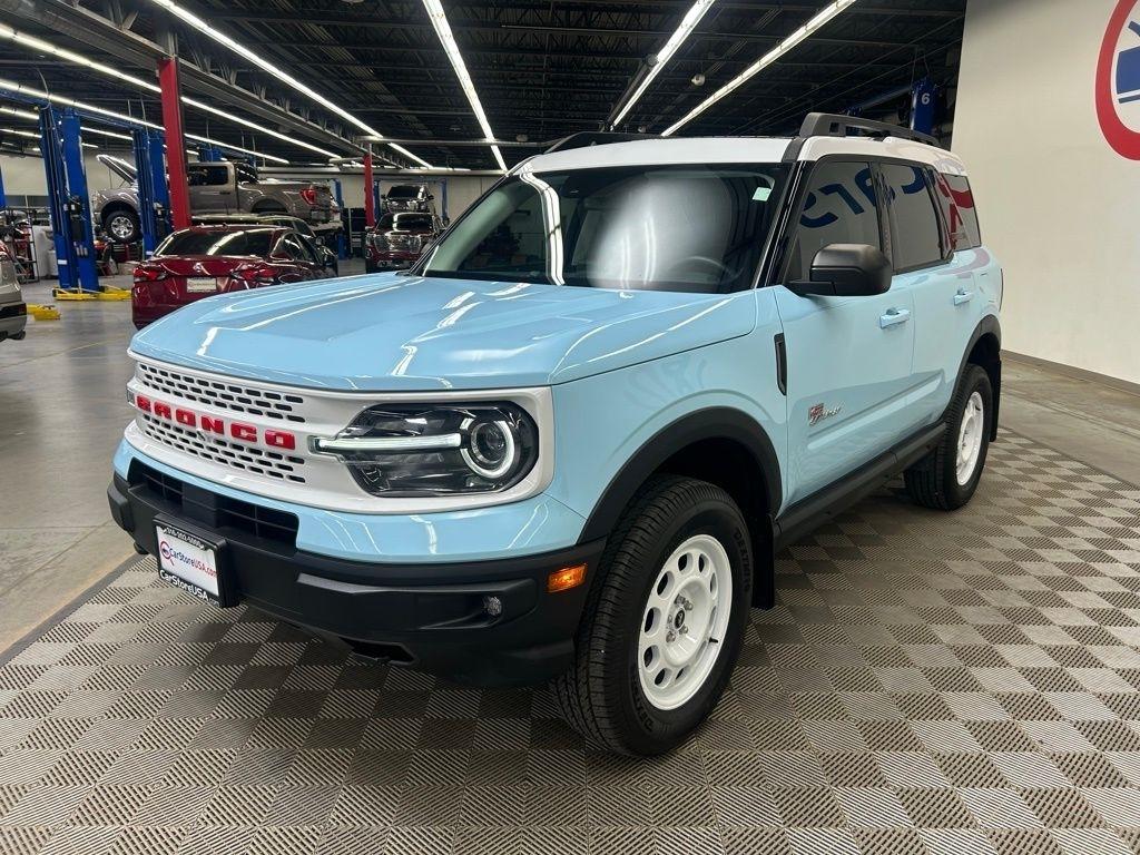 CARFAX One-Owner. THIS VEHICLE IS EQUIPPED WITH THE FOLLOWING FEATURES AND OPTIONS Equipment Group 410A, 10 Speakers, 3.80 Axle Ratio, 4-Wheel Disc Brakes, ABS brakes, Air Conditioning, Alloy wheels, AM/FM radio: SiriusXM, AM/FM Stereo, Auto High-beam Headlights, Auto-dimming Rear-View mirror, Automatic temperature control, Brake assist, Cargo Management System, Compass, Delay-off headlights, Driver door bin, Driver vanity mirror, Dual front impact airbags, Dual front side impact airbags, Electronic Stability Control, Emergency communication system: SYNC 3 911 Assist, Four wheel independent suspension, Front & Rear Floor Liners w/Carpet Mats, Front & Rear Splash Guards, Front anti-roll bar, Front Bucket Seats, Front Center Armrest, Front dual zone A/C, Front fog lights, Front License Plate Bracket, Front reading lights, Fully automatic headlights, Garage door transmitter, Heated door mirrors, Heated front seats, Heated steering wheel, Illuminated entry, Knee airbag, Low tire pressure warning, Lthr-Trimmed/Vinyl Htd Sport Contour Bucket Seats, Memory seat, Navigation System, Occupant sensing airbag, Outside temperature display, Overhead airbag, Overhead console, Panic alarm, Passenger door bin, Passenger vanity mirror, Power door mirrors, Power driver seat, Power moonroof, Power passenger seat, Power steering, Power windows, Radio data system, Rear anti-roll bar, Rear Parking Sensors, Rear reading lights, Rear seat center armrest, Rear window defroster, Rear window wiper, Remote keyless entry, Security system, SiriusXM, Speed control, Speed-sensing steering, Speed-Sensitive Wipers, Split folding rear seat, Steering wheel mounted audio controls, SYNC 3 Communications & Entertainment System, SYNC 3/Apple CarPlay/Android Auto, Tachometer, Telescoping steering wheel, Tilt steering wheel, Traction control, Trip computer, Variably intermittent wipers, and Wheels: 17" Oxford White-Painted Aluminum. Blue 2023 Ford Bronco Sport Heritage Limited 4WD 8-Speed Automatic EcoBoost 2.0L I4 GTDi DOHC Turbocharged VCT