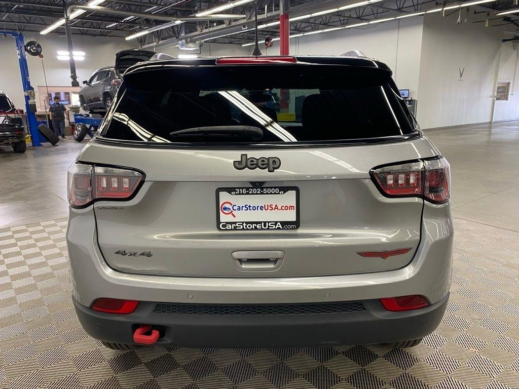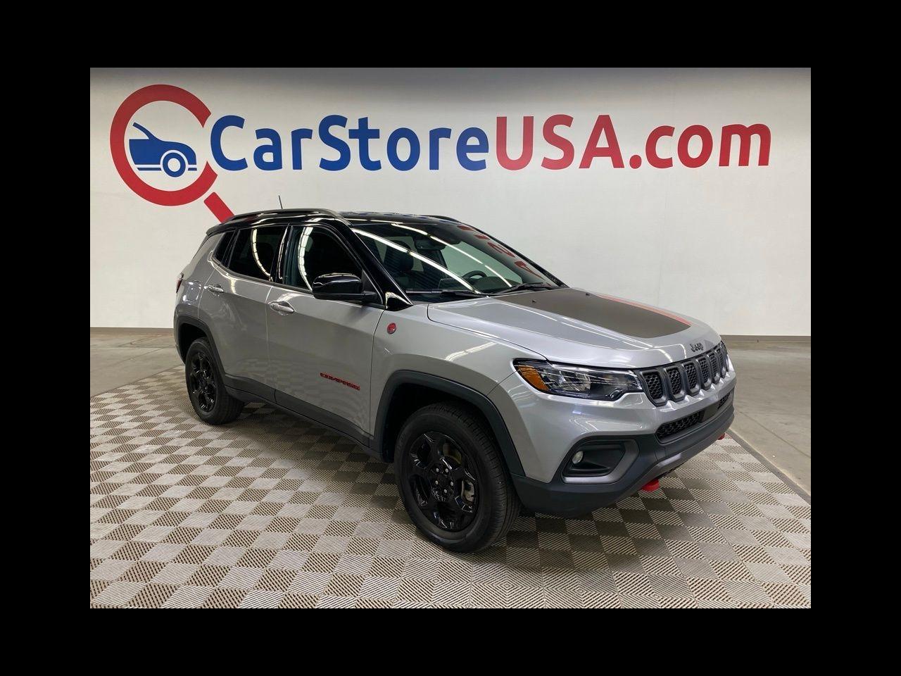 CARFAX One-Owner. THIS VEHICLE IS EQUIPPED WITH THE FOLLOWING FEATURES AND OPTIONS Quick Order Package 29E, 10.1" Touchscreen Display, 4-Wheel Disc Brakes, 4.398 Final Drive Ratio, 6 Speakers, ABS brakes, Air Conditioning, Alloy wheels, AM/FM radio: SiriusXM, Auto High-beam Headlights, Auto-dimming Rear-View mirror, Automatic temperature control, Brake assist, Bumpers: body-color, Compass, Delay-off headlights, Disassociated Touchscreen Display, Driver door bin, Driver vanity mirror, Dual front impact airbags, Dual front side impact airbags, Electronic Stability Control, Four wheel independent suspension, Front anti-roll bar, Front Bucket Seats, Front Center Armrest w/Storage, Front dual zone A/C, Front fog lights, Front License Plate Bracket, Front reading lights, Fully automatic headlights, Heated door mirrors, Illuminated entry, Knee airbag, Leather Shift Knob, Low tire pressure warning, Occupant sensing airbag, Outside temperature display, Overhead airbag, Overhead console, Panic alarm, ParkView Rear Back-Up Camera, Passenger door bin, Passenger vanity mirror, Power door mirrors, Power steering, Power windows, Premium Cloth/Leather Trim Bucket Seats, Radio: Uconnect 5 w/10.1" Display, Rain sensing wipers, Rear anti-roll bar, Rear seat center armrest, Rear window defroster, Rear window wiper, Remote keyless entry, Security system, SiriusXM Radio Service, Speed control, Split folding rear seat, Spoiler, Steering wheel mounted audio controls, Tachometer, Telescoping steering wheel, Tilt steering wheel, Traction control, Trip computer, Turn signal indicator mirrors, Variably intermittent wipers, and Wheels: 17" x 6.5" Painted Black Aluminum. Clean CARFAX. Billet Silver Metallic Clearcoat 2023 Jeep Compass Trailhawk 4WD 8-Speed Automatic 2.0L I4 DOHC