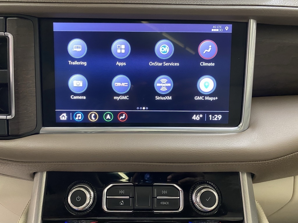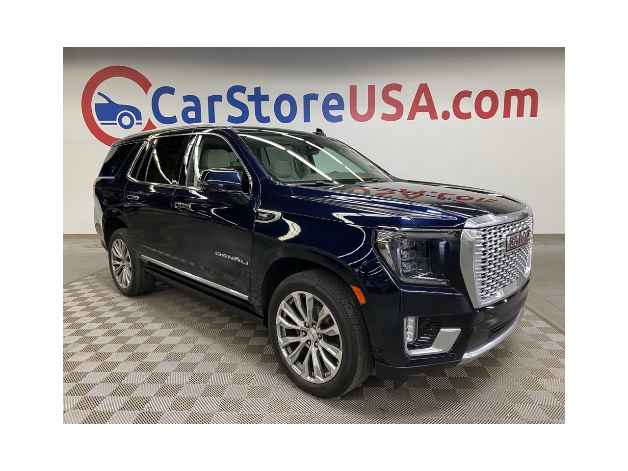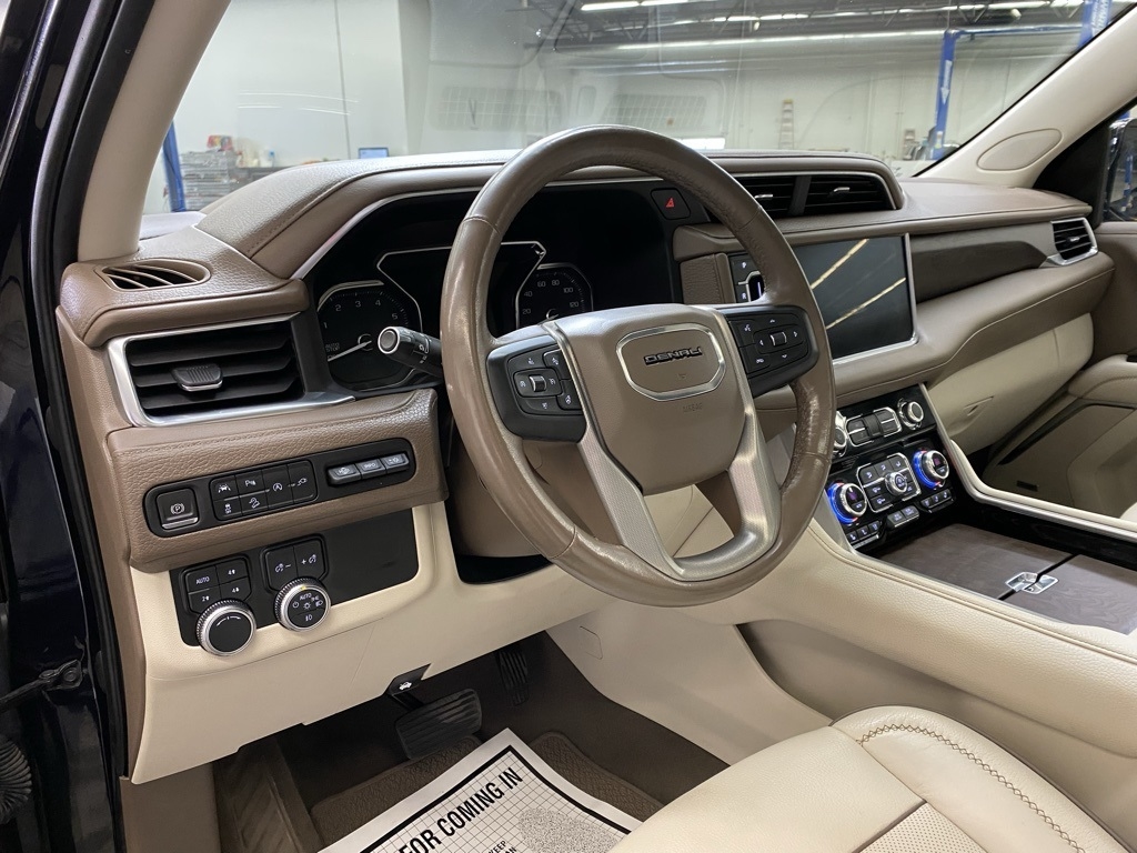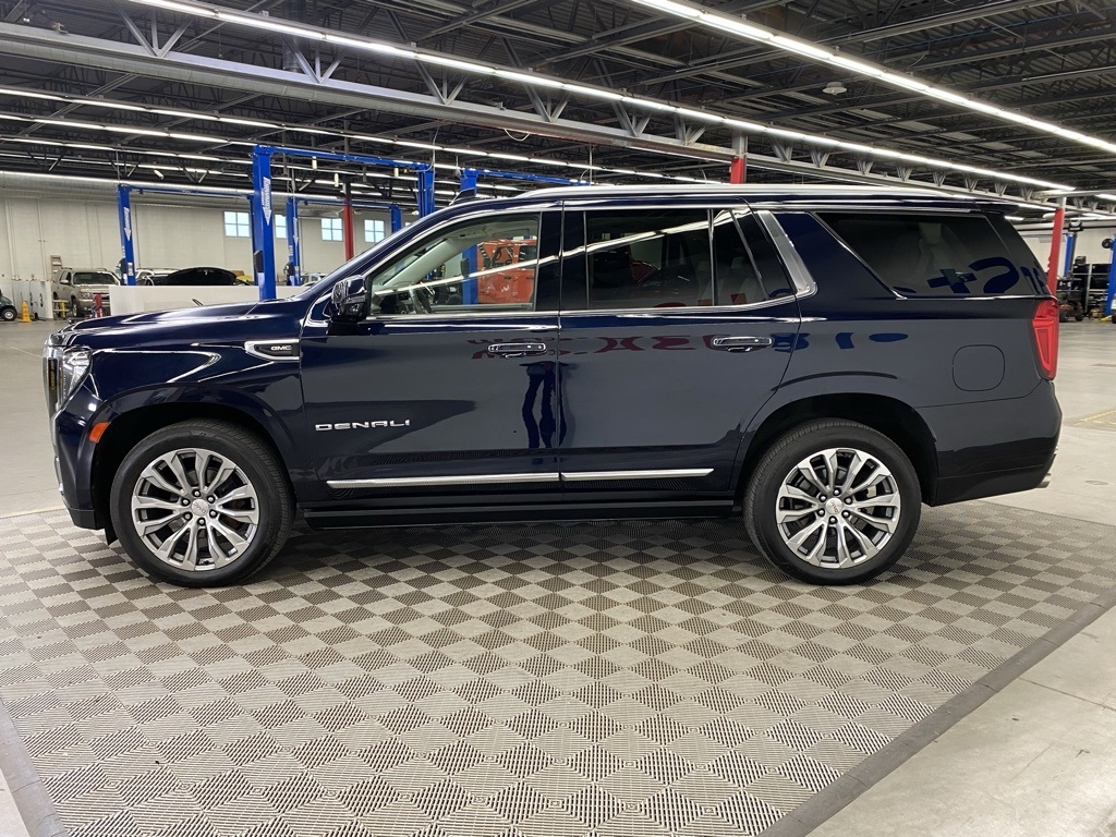 CARFAX One-Owner. THIS VEHICLE IS EQUIPPED WITH THE FOLLOWING FEATURES AND OPTIONS Advanced Security Package (Glass Breakage Sensor, Theft-Deterrent Alarm System, Vehicle Inclination Sensor, and Vehicle Interior Movement Sensor), Advanced Technology Package (Adaptive Cruise Control, Enhanced Automatic Emergency Braking, Inside Rearview Auto-Dimming Rear Camera Mirror, and Rear Camera Mirror Washer), Denali Premium Package (Dual-Pane Panoramic Power Sunroof and Power-Retractable Assist Steps), License Plate Front Mounting Package, Preferred Equipment Group 5SA (12-Way Power Seat Adjusters, 15" Diagonal Multi-Color Head-Up Display, 2 Presets For Outside Rearview Mirrors, 3rd Row 60/40 Power-Folding Split-Bench Seat, Bright Front & Rear Door Sill Plates, Chrome Door Handles w/Body-Color Strip, Dual Exhaust System, Galvano Bodyside Moldings, Hands-Free Power Programmable Rear Liftgate, HD Surround Vision, Heated & Ventilated Driver & Front Passenger Seats, Heated 2nd Row Outboard Position Seats, Heated Automatic Steering Wheel, Heated Driver & Front Passenger Seats, Hill Descent Control, Inside Rear-View Auto-Dimming Mirror, Outside Heated Power-Adjustable Mirrors, Power Release 2nd Row Bucket Seats, Power Tilt & Telescopic Steering Column, Rear Pedestrian Alert, Safety Alert Seat, and Universal Home Remote), 14 Speakers, 3.23 Rear Axle Ratio, 3rd row seats: split-bench, 4-Wheel Disc Brakes, ABS brakes, Adaptive suspension, Air Conditioning, Alloy wheels, AM/FM radio: SiriusXM with 360L, Apple CarPlay/Android Auto, Auto High-beam Headlights, Auto-dimming door mirrors, Auto-dimming Rear-View mirror, Auto-leveling suspension, Automatic Emergency Braking, Automatic temperature control, Bodyside moldings, Bose 14-Speaker Surround w/CenterPoint, Brake assist, Bumpers: body-color, Compass, Delay-off headlights, Driver door bin, Driver vanity mirror, Dual front impact airbags, Dual front side impact airbags, Electronic Stability Control, Emergency communication system: OnStar and GMC connected services capable, Following Distance Indicator, Forward Collision Alert, Four wheel independent suspension, Front & Rear Park Assist, Front anti-roll bar, Front Bucket Seats, Front Center Armrest, Front dual zone A/C, Front fog lights, Front Pedestrian Braking, Front reading lights, Fully automatic headlights, Garage door transmitter, HD Radio, Heads-Up Display, Heated door mirrors, Heated front seats, Heated rear seats, Heated steering wheel, Illuminated entry, IntelliBeam Automatic High Beam On/Off, Lane Change Alert w/Side Blind Zone Alert, Lane Keep Assist w/Lane Departure Warning, Leather steering wheel, Low tire pressure warning, Magnetic Ride Control Suspension, Memory seat, Navigation System, Occupant sensing airbag, Outside temperature display, Overhead airbag, Overhead console, Panic alarm, Passenger door bin, Passenger vanity mirror, Perforated Leather Seating Surfaces, Power door mirrors, Power driver seat, Power Liftgate, Power passenger seat, Power steering, Power windows, Radio: AM/FM/SiriusXM w/Navigation, Rain sensing wipers, Rear air conditioning, Rear anti-roll bar, Rear Cross Traffic Alert, Rear reading lights, Rear window defroster, Rear window wiper, Remote keyless entry, Roof rack: rails only, Security system, SiriusXM w/360L, Speed control, Speed-sensing steering, Split folding rear seat, Spoiler, Steering wheel memory, Steering wheel mounted audio controls, Tachometer, Telescoping steering wheel, Tilt steering wheel, Traction control, Trip computer, Turn signal indicator mirrors, Variably intermittent wipers, Ventilated front seats, Voltmeter, Wheel Locks, Wheels: 20" x 9" 6-Spoke Polished Aluminum, and Wheels: 22" x 9" Bright Machined Aluminum. Clean CARFAX. Midnight Blue Metallic 2021 GMC Yukon Denali 4WD 10-Speed Automatic with Overdrive EcoTec3 6.2L V8