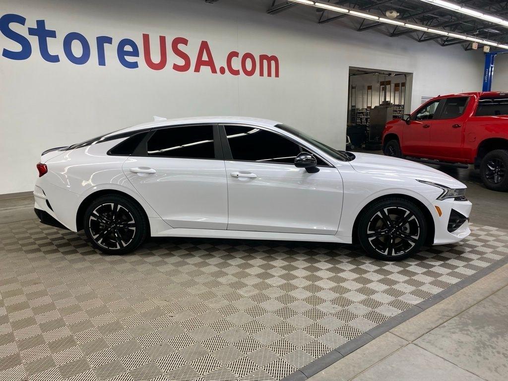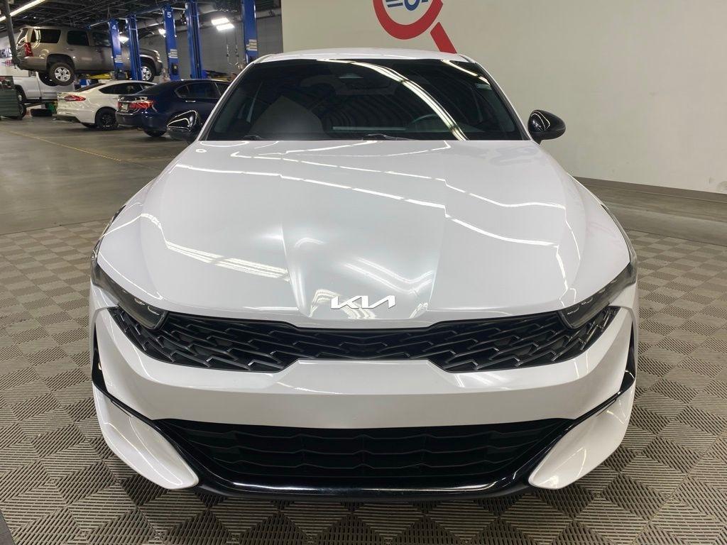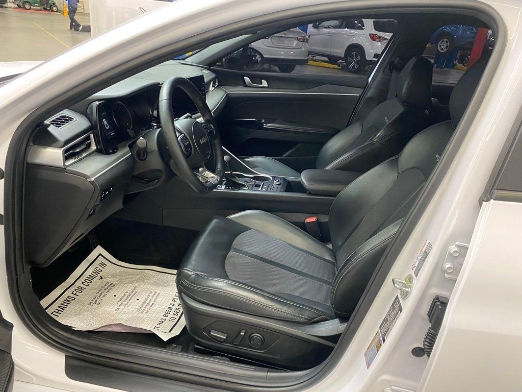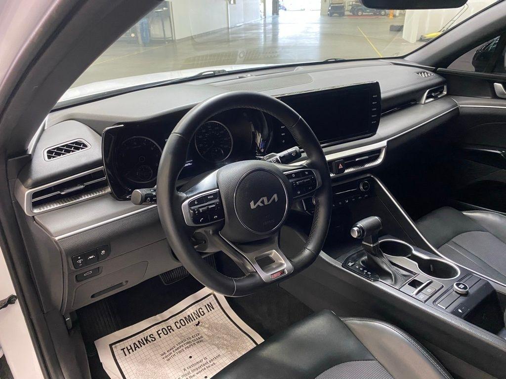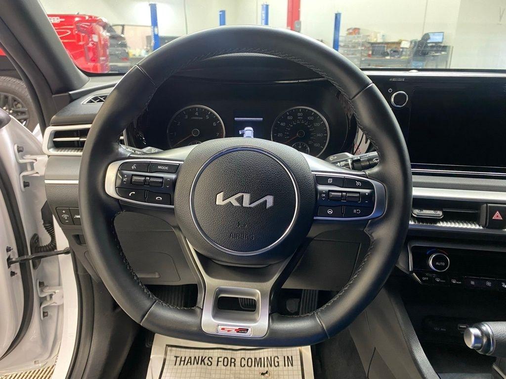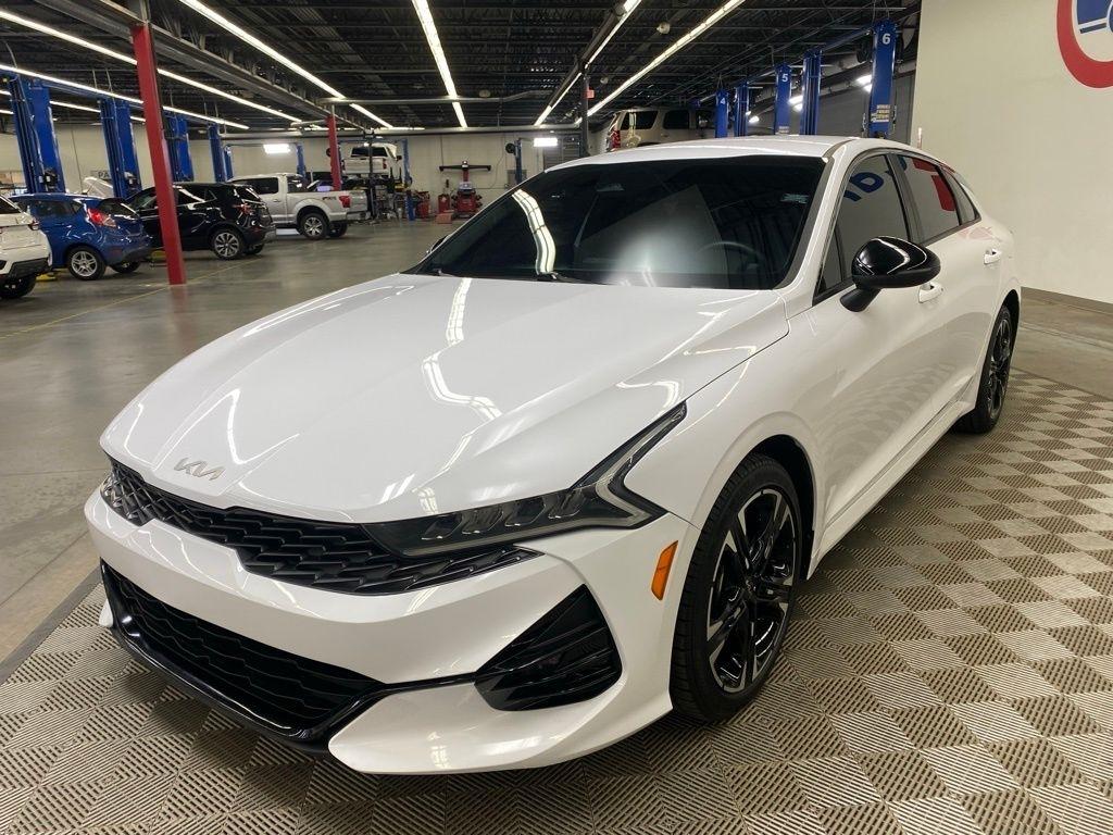 THIS VEHICLE IS EQUIPPED WITH THE FOLLOWING FEATURES AND OPTIONS 4-Wheel Disc Brakes, 6 Speakers, ABS brakes, Air Conditioning, Alloy wheels, AM/FM radio: SiriusXM, Apple CarPlay & Android Auto, Auto High-beam Headlights, Automatic temperature control, Brake assist, Bumpers: body-color, Cargo Net, Cloth/Leatherette Seat Trim, Delay-off headlights, Driver door bin, Driver vanity mirror, Dual front impact airbags, Dual front side impact airbags, EC Mirror w/Homelink, Electronic Stability Control, Four wheel independent suspension, Front anti-roll bar, Front Bucket Seats, Front Center Armrest, Front dual zone A/C, Front fog lights, Front reading lights, Fully automatic headlights, Heated door mirrors, Illuminated entry, Knee airbag, Low tire pressure warning, Navigation System, Occupant sensing airbag, Outside temperature display, Overhead airbag, Overhead console, Panic alarm, Passenger door bin, Passenger vanity mirror, Power door mirrors, Power driver seat, Power steering, Power windows, Radio data system, Radio: AM/FM/MP3 Audio System, Rear anti-roll bar, Rear seat center armrest, Rear side impact airbag, Rear window defroster, Remote keyless entry, Security system, Speed control, Speed-sensing steering, Split folding rear seat, Spoiler, Sport steering wheel, Steering wheel mounted audio controls, Tachometer, Telescoping steering wheel, Tilt steering wheel, Traction control, Trip computer, Turn signal indicator mirrors, Variably intermittent wipers, and Wheels: 7.5J x 18" Gloss Black Machined Finish Alloy. Glacial White Pearl 2022 Kia K5 GT-Line FWD 8-Speed Automatic I4