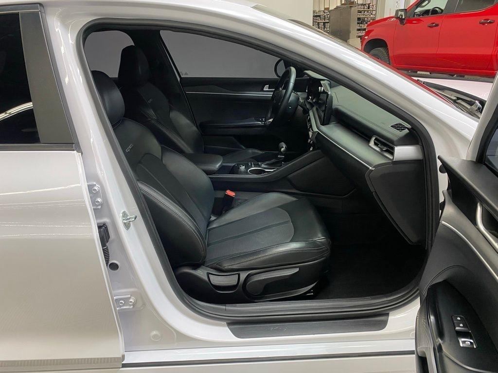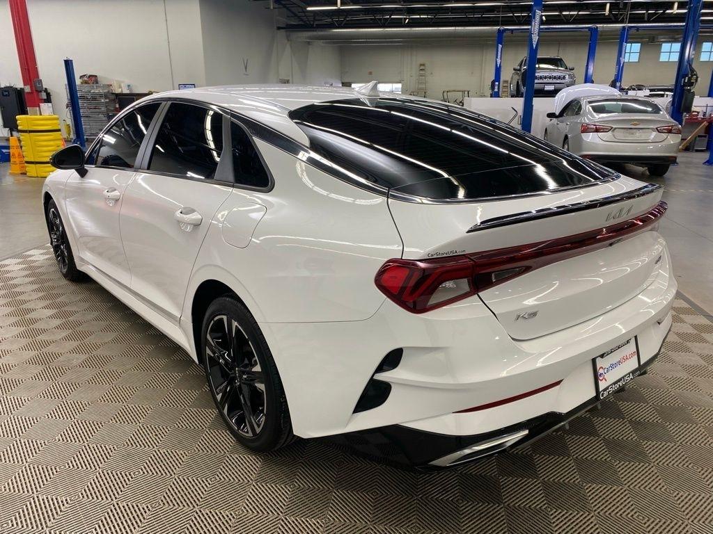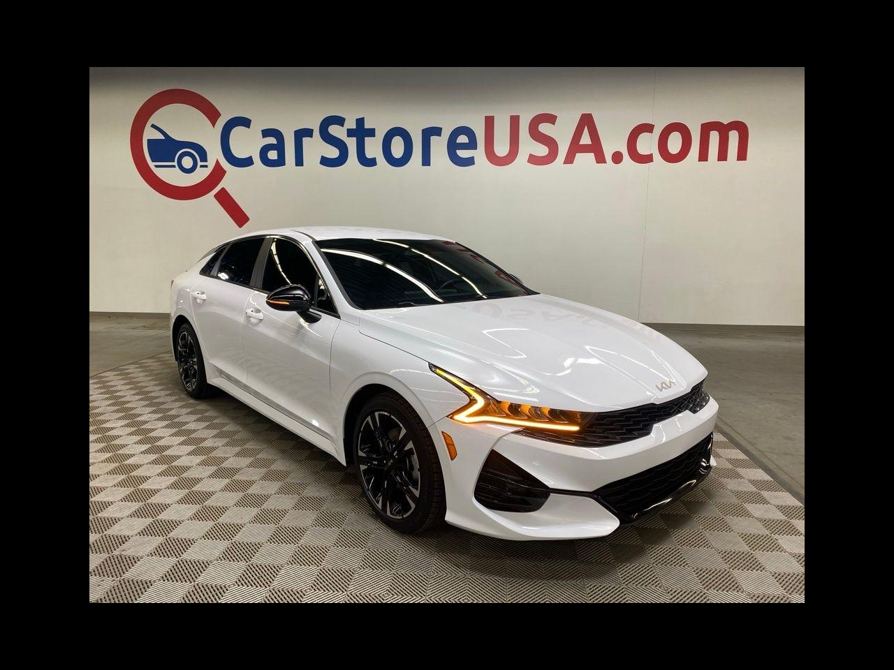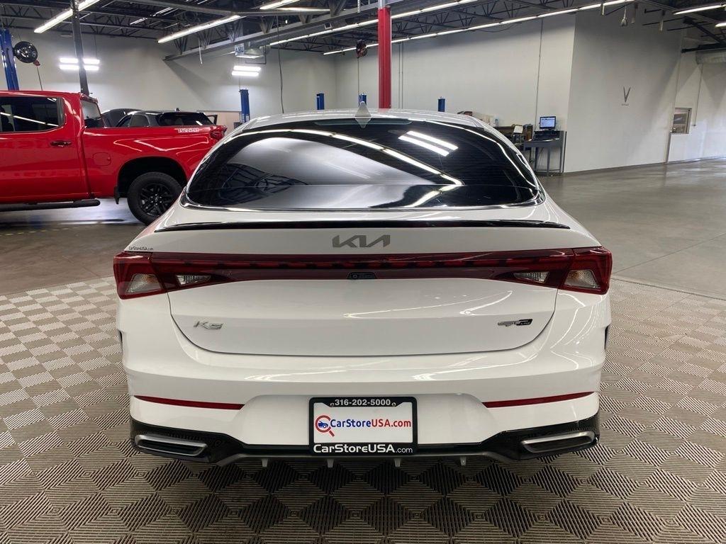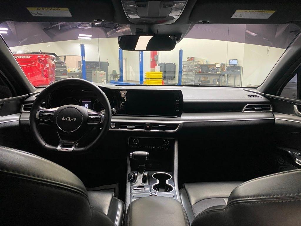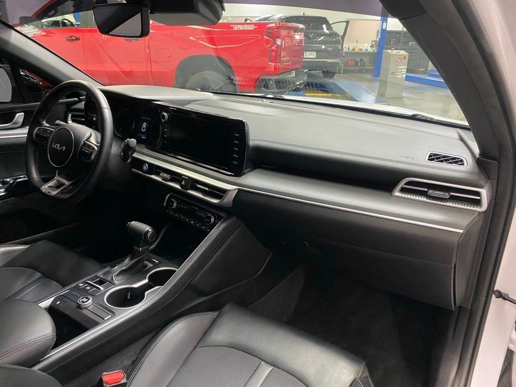 THIS VEHICLE IS EQUIPPED WITH THE FOLLOWING FEATURES AND OPTIONS 4-Wheel Disc Brakes, 6 Speakers, ABS brakes, Air Conditioning, Alloy wheels, AM/FM radio: SiriusXM, Apple CarPlay & Android Auto, Auto High-beam Headlights, Automatic temperature control, Brake assist, Bumpers: body-color, Cargo Net, Cloth/Leatherette Seat Trim, Delay-off headlights, Driver door bin, Driver vanity mirror, Dual front impact airbags, Dual front side impact airbags, EC Mirror w/Homelink, Electronic Stability Control, Four wheel independent suspension, Front anti-roll bar, Front Bucket Seats, Front Center Armrest, Front dual zone A/C, Front fog lights, Front reading lights, Fully automatic headlights, Heated door mirrors, Illuminated entry, Knee airbag, Low tire pressure warning, Navigation System, Occupant sensing airbag, Outside temperature display, Overhead airbag, Overhead console, Panic alarm, Passenger door bin, Passenger vanity mirror, Power door mirrors, Power driver seat, Power steering, Power windows, Radio data system, Radio: AM/FM/MP3 Audio System, Rear anti-roll bar, Rear seat center armrest, Rear side impact airbag, Rear window defroster, Remote keyless entry, Security system, Speed control, Speed-sensing steering, Split folding rear seat, Spoiler, Sport steering wheel, Steering wheel mounted audio controls, Tachometer, Telescoping steering wheel, Tilt steering wheel, Traction control, Trip computer, Turn signal indicator mirrors, Variably intermittent wipers, and Wheels: 7.5J x 18" Gloss Black Machined Finish Alloy. Glacial White Pearl 2022 Kia K5 GT-Line FWD 8-Speed Automatic I4