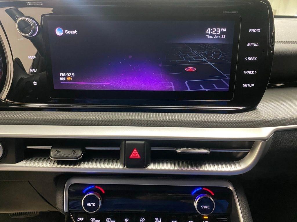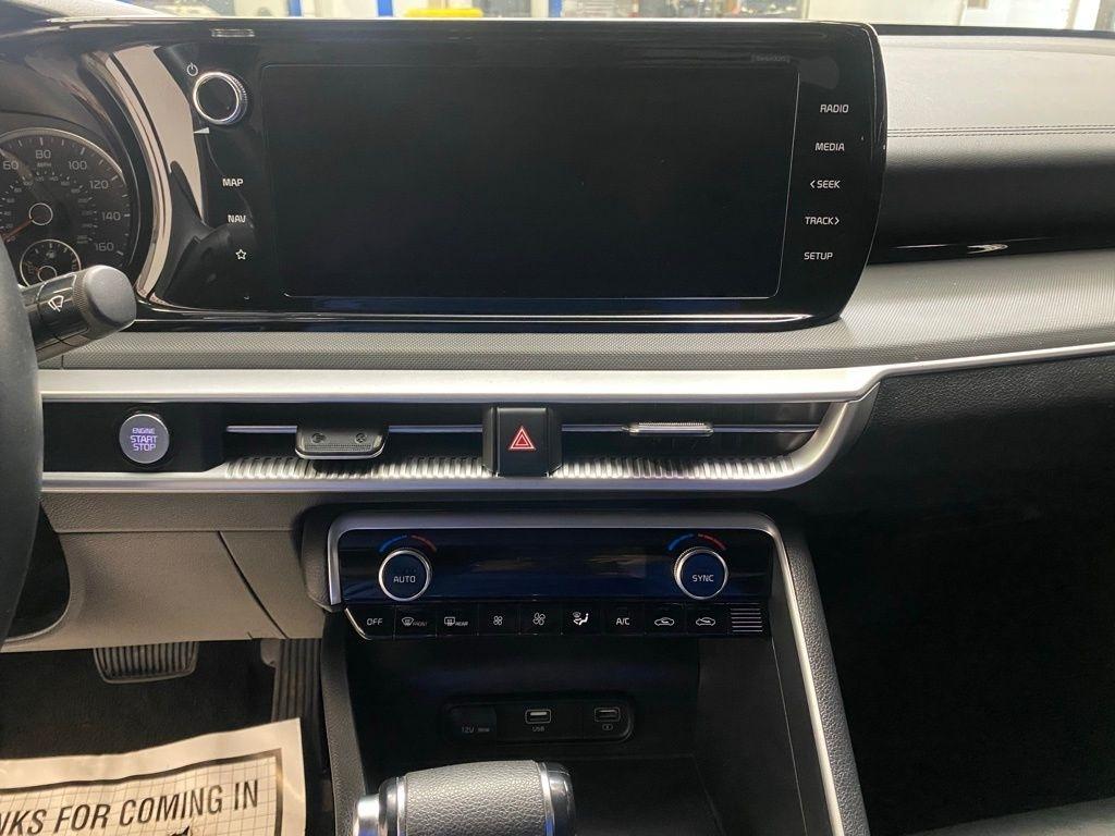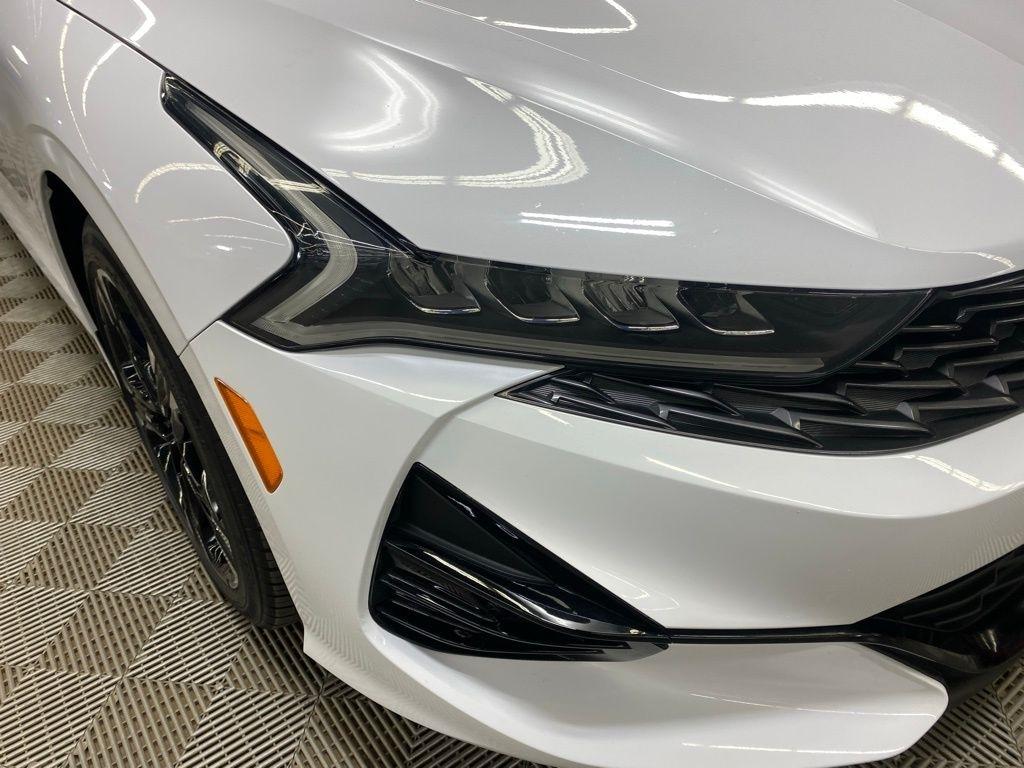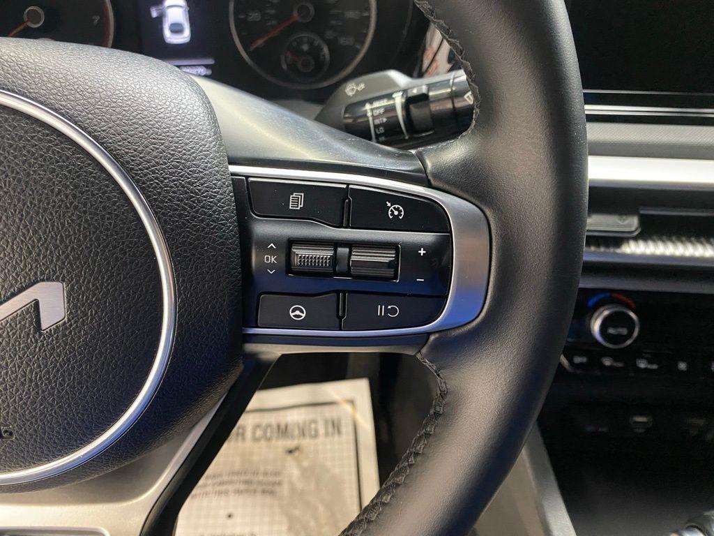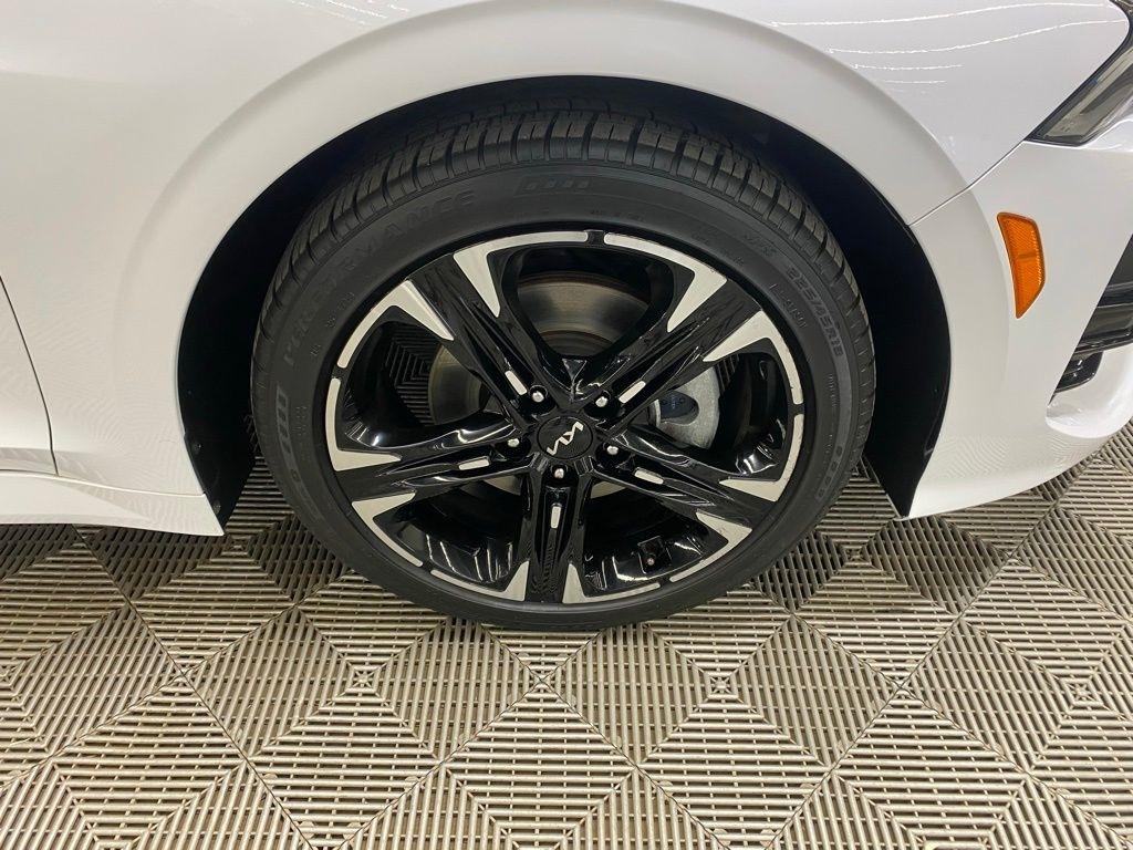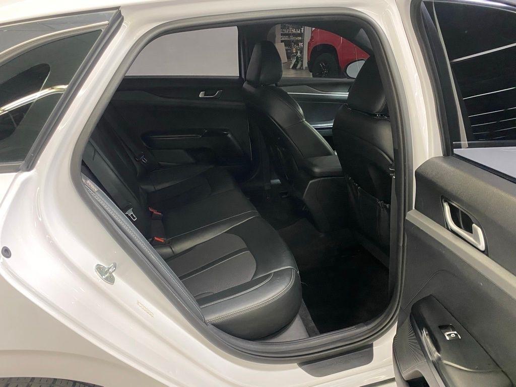 THIS VEHICLE IS EQUIPPED WITH THE FOLLOWING FEATURES AND OPTIONS 4-Wheel Disc Brakes, 6 Speakers, ABS brakes, Air Conditioning, Alloy wheels, AM/FM radio: SiriusXM, Apple CarPlay & Android Auto, Auto High-beam Headlights, Automatic temperature control, Brake assist, Bumpers: body-color, Cargo Net, Cloth/Leatherette Seat Trim, Delay-off headlights, Driver door bin, Driver vanity mirror, Dual front impact airbags, Dual front side impact airbags, EC Mirror w/Homelink, Electronic Stability Control, Four wheel independent suspension, Front anti-roll bar, Front Bucket Seats, Front Center Armrest, Front dual zone A/C, Front fog lights, Front reading lights, Fully automatic headlights, Heated door mirrors, Illuminated entry, Knee airbag, Low tire pressure warning, Navigation System, Occupant sensing airbag, Outside temperature display, Overhead airbag, Overhead console, Panic alarm, Passenger door bin, Passenger vanity mirror, Power door mirrors, Power driver seat, Power steering, Power windows, Radio data system, Radio: AM/FM/MP3 Audio System, Rear anti-roll bar, Rear seat center armrest, Rear side impact airbag, Rear window defroster, Remote keyless entry, Security system, Speed control, Speed-sensing steering, Split folding rear seat, Spoiler, Sport steering wheel, Steering wheel mounted audio controls, Tachometer, Telescoping steering wheel, Tilt steering wheel, Traction control, Trip computer, Turn signal indicator mirrors, Variably intermittent wipers, and Wheels: 7.5J x 18" Gloss Black Machined Finish Alloy. Glacial White Pearl 2022 Kia K5 GT-Line FWD 8-Speed Automatic I4